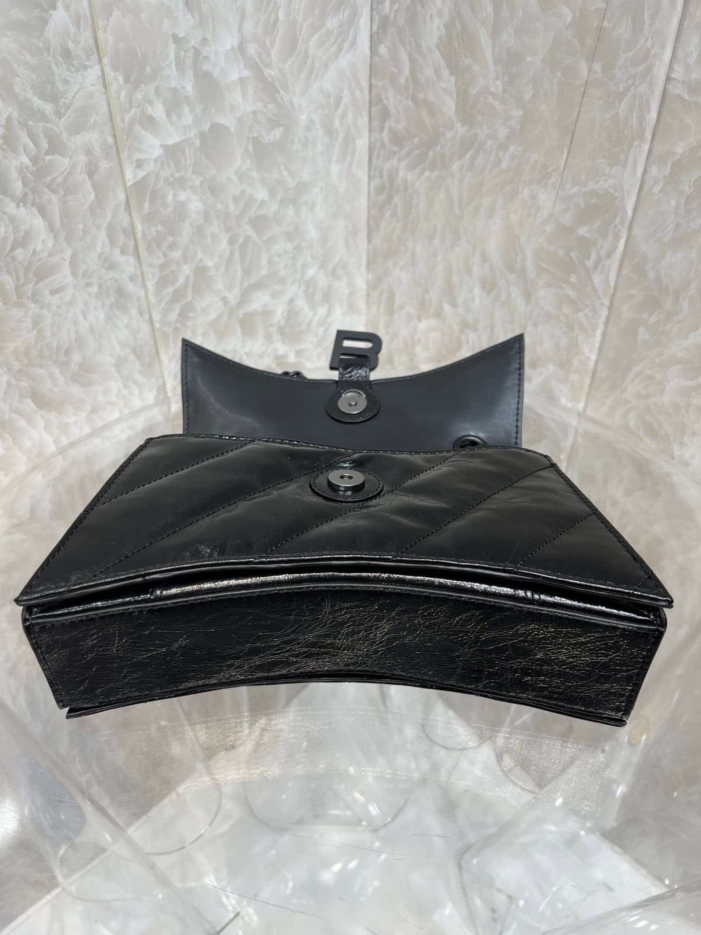 From Balenciaga’s 22-year autumn/winter series, a Crush handbag with a powerful and practical large bag is back! It breaks the traditional stiff bag shape. It is made of soft calfskin with stitching and a thick metal sliding chain shoulder strap, which can be switched at will. Over the shoulder Metal calfskin calfskin and quilted material • Chain strap bag • Curved bottom • Shoulder and cross-body chain shoulder strap (50 cm) • Aged silver B logo hardware • Magnetic closure with studs • 3 compartments Layer • 1 zipper inner pocket 1 😍 inner flat pocket.