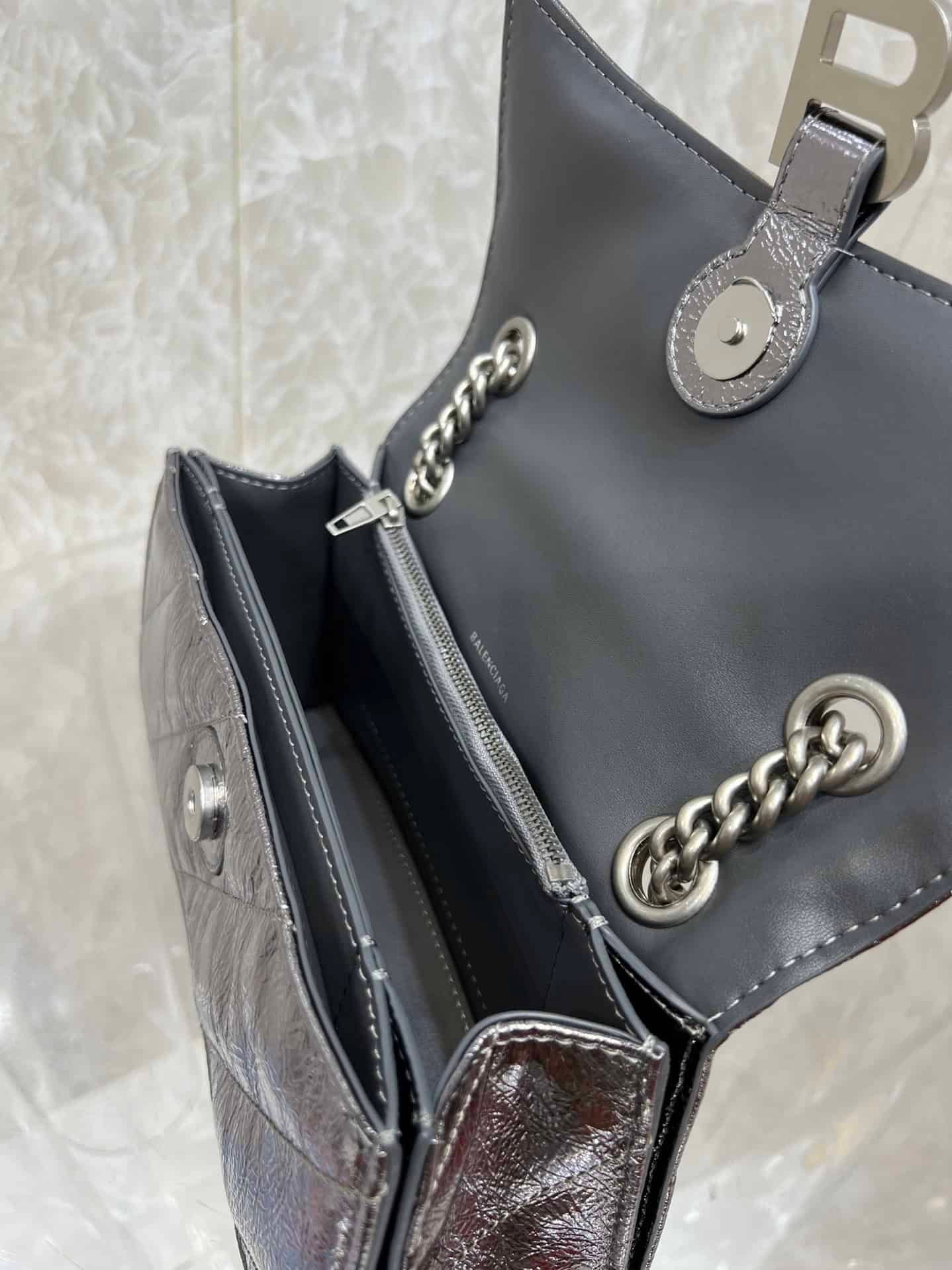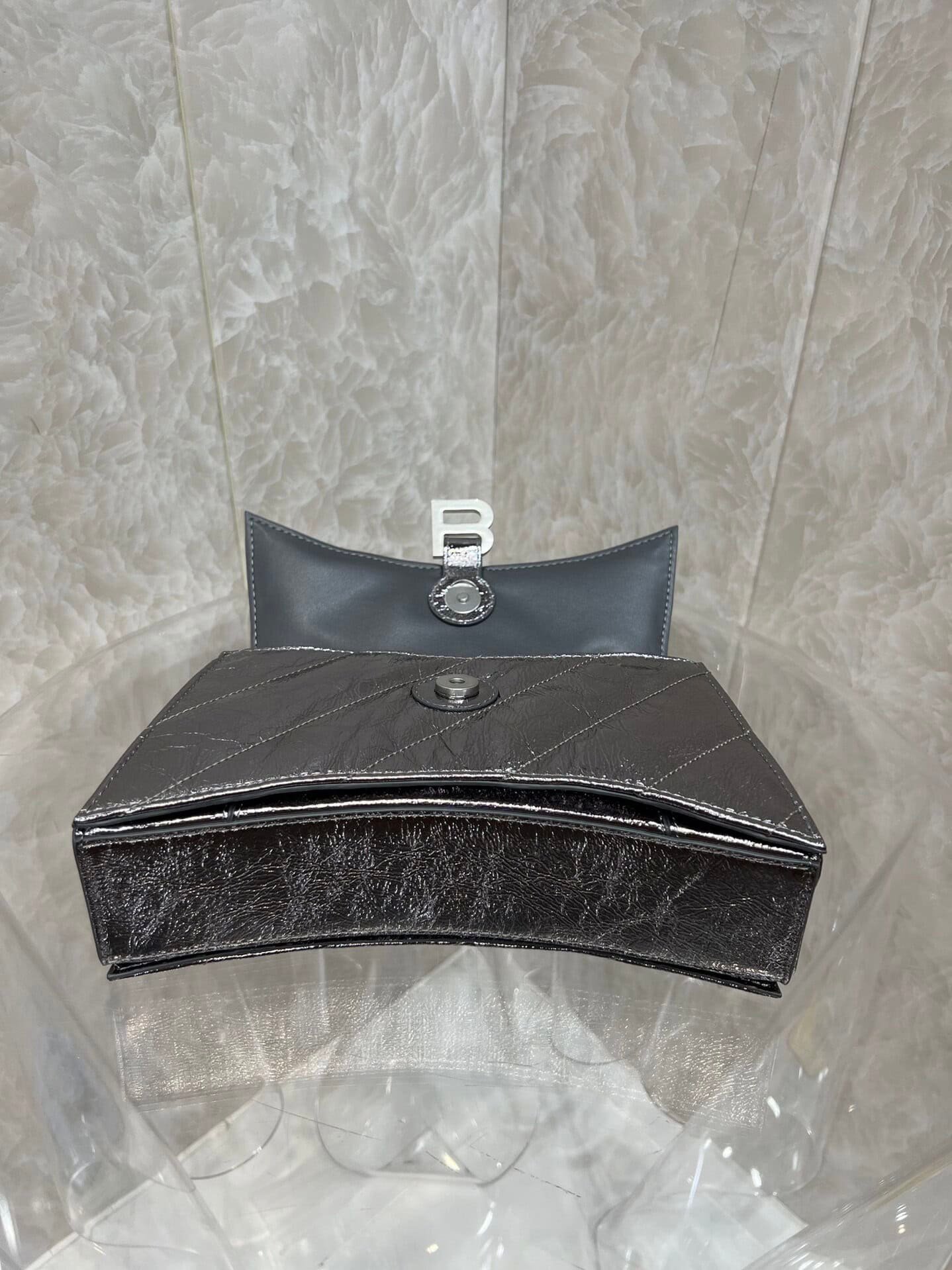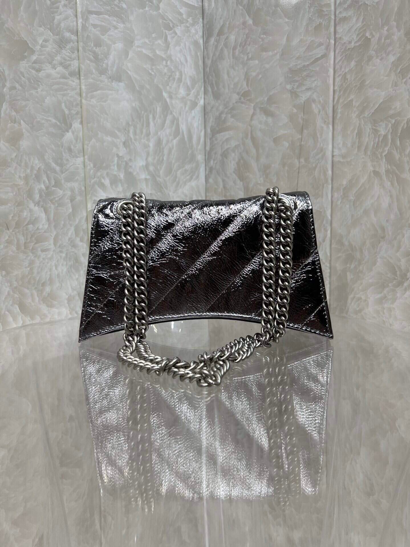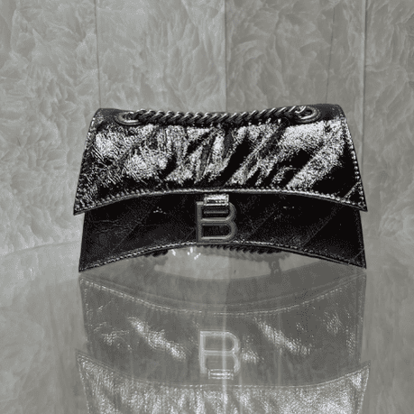 From Balenciaga’s 22-year autumn/winter series, a Crush handbag with a powerful and practical large bag is back! It breaks the traditional stiff bag shape. It is made of soft calfskin with stitching and a thick metal sliding chain shoulder strap, which can be switched at will. Over the shoulder Metal calfskin calfskin and quilted material • Chain strap bag • Curved bottom • Shoulder and cross-body chain shoulder strap (50 cm) • Aged silver B logo hardware • Magnetic closure with studs • 3 compartments Layer • 1 zipper inner pocket 1 😍 inner flat pocket.
