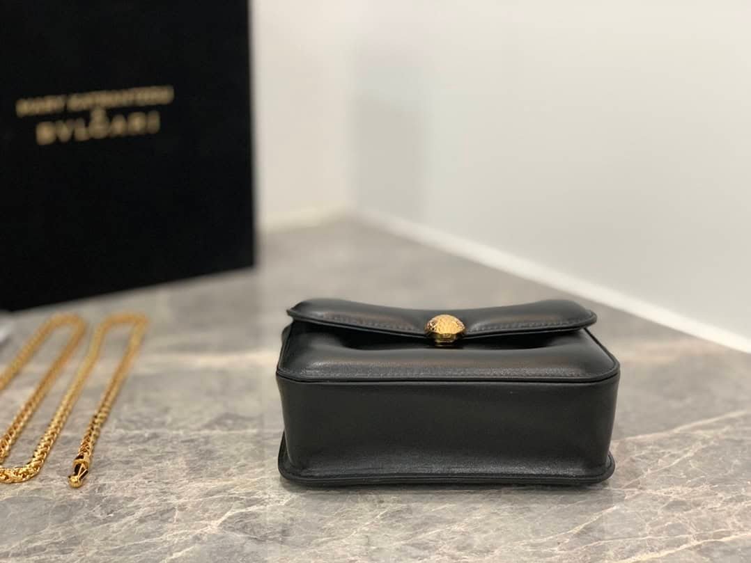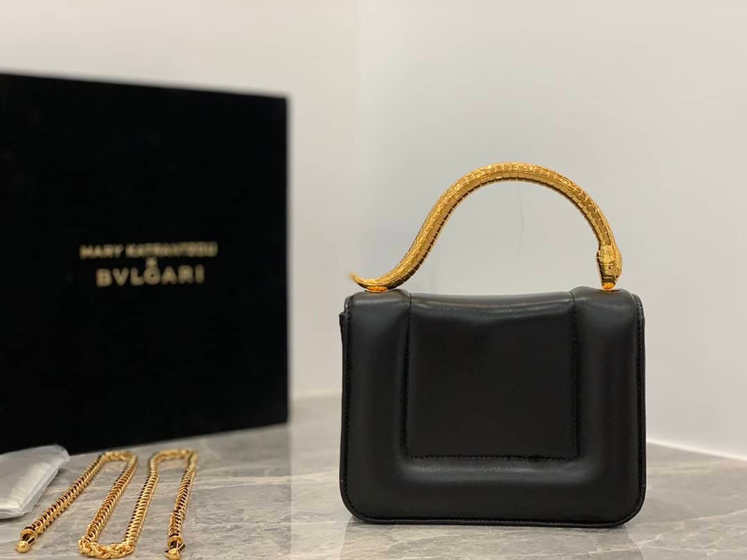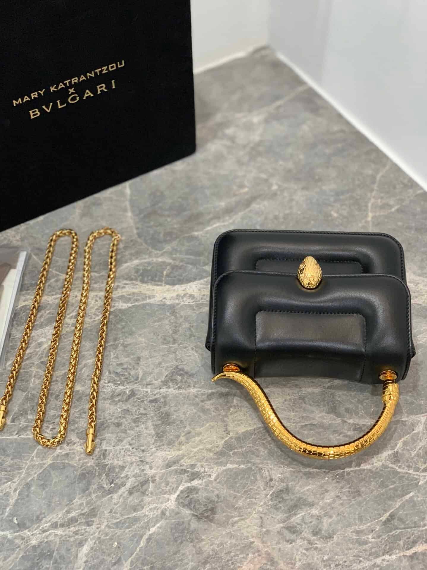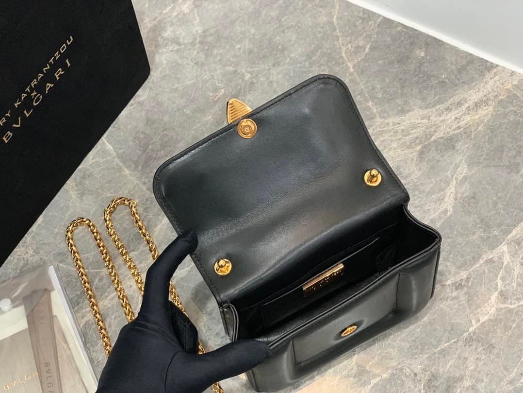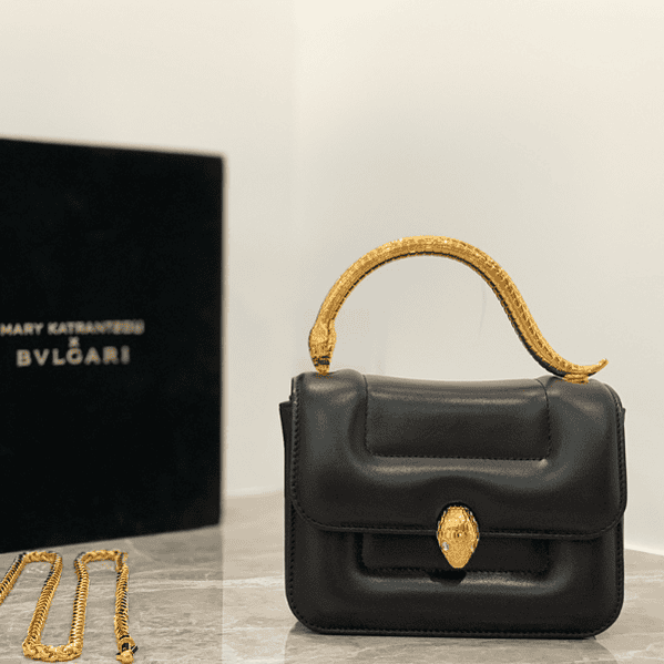The “MARY KATRANTZOU” series reinterprets the classic SERPENTI pattern, draws inspiration from the transformation of the spiritual snake, and launches a new exquisite co-branded series. It is made of black lambskin and paired with gold-plated brass accessories. Gold-plated brass reinterprets the classic SERPENTI snake head buckle. , with charming crystal eyes, this special handbag has a storage compartment, a detachable snake handle and a detachable chain shoulder strap, which can be used as a crossbody bag, making it versatile. Small size with an open interior pocket and an internal metal plaque engraved with the “MARY KATRANTZOU X BVLGARI” logo.
