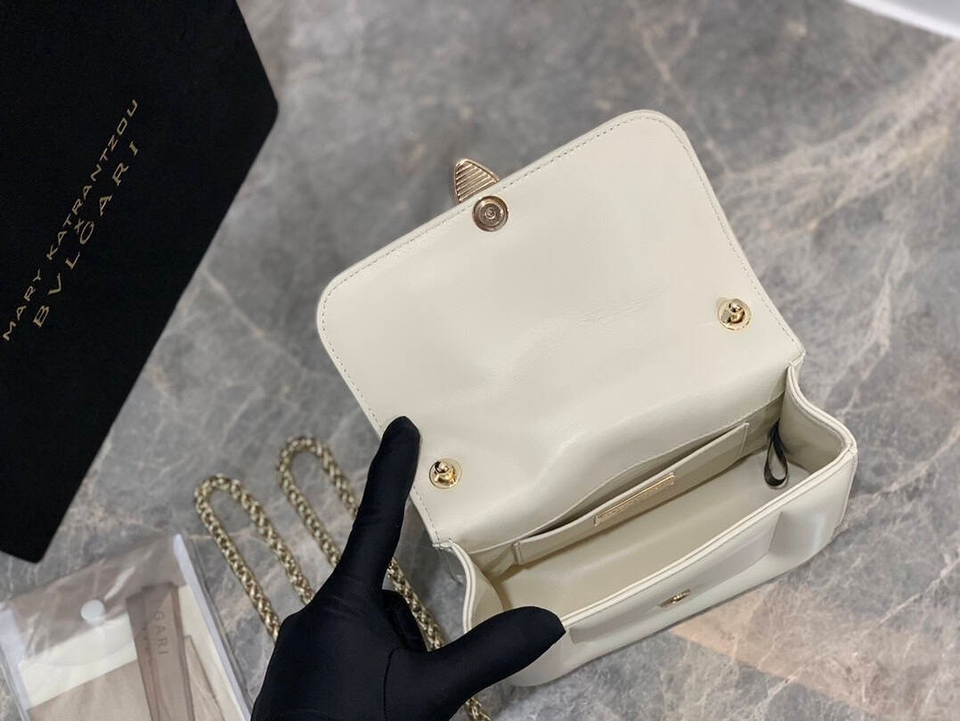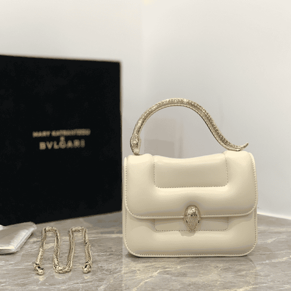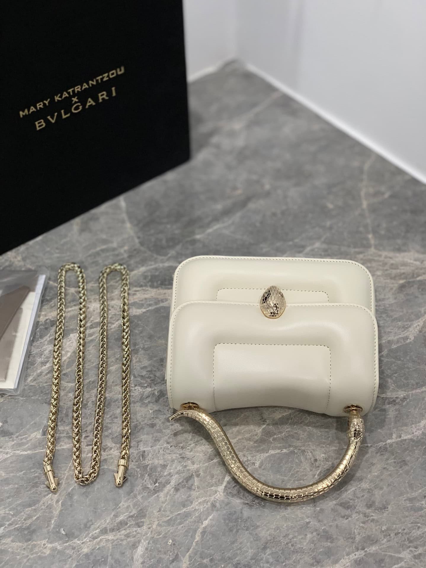 The “MARY KATRANTZOU” series reinterprets the classic SERPENTI pattern, draws inspiration from the transformation of the spiritual snake, and launches a new exquisite co-branded series. It is made of black lambskin and paired with gold-plated brass accessories. Gold-plated brass reinterprets the classic SERPENTI snake head buckle. , with charming crystal eyes, this special handbag has a storage compartment, a detachable snake handle and a detachable chain shoulder strap, which can be used as a crossbody bag, making it versatile. Small size with an open interior pocket and an internal metal plaque engraved with the “MARY KATRANTZOU X BVLGARI” logo.