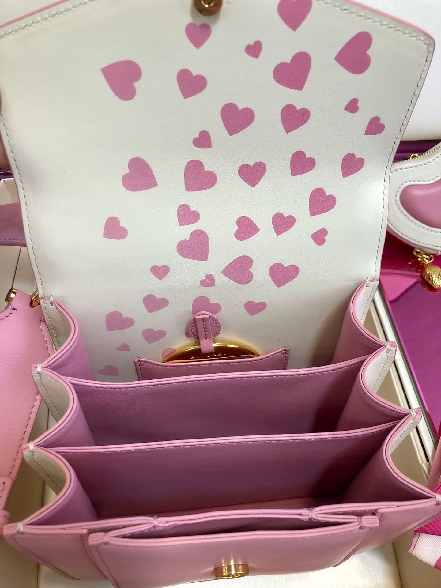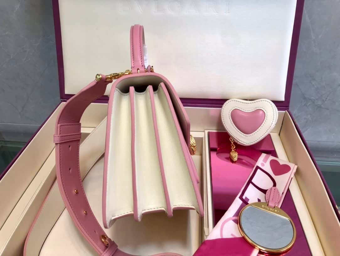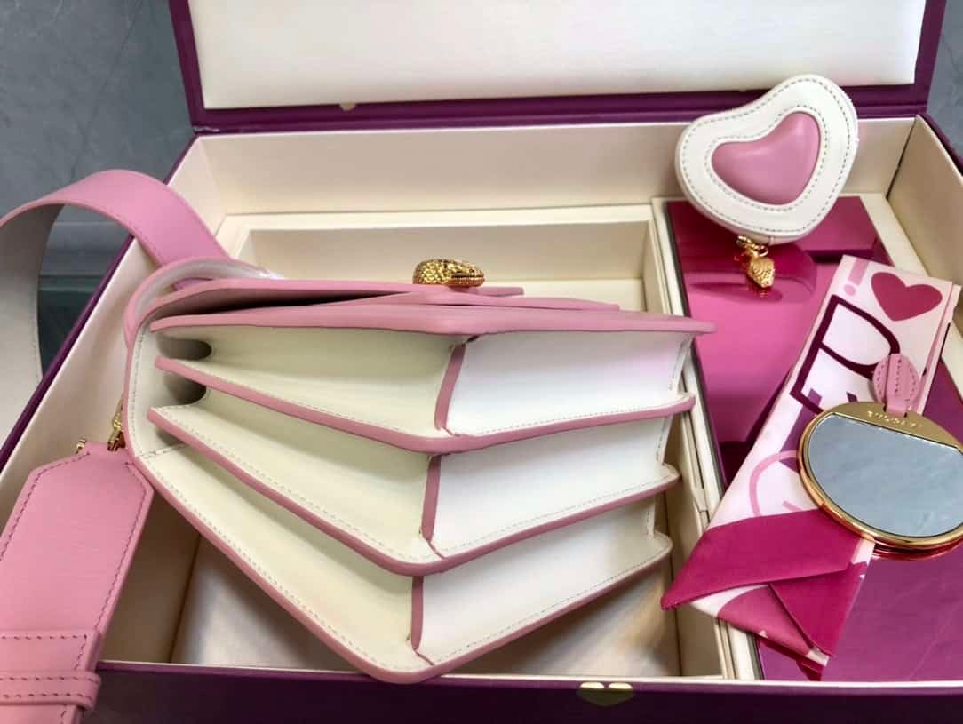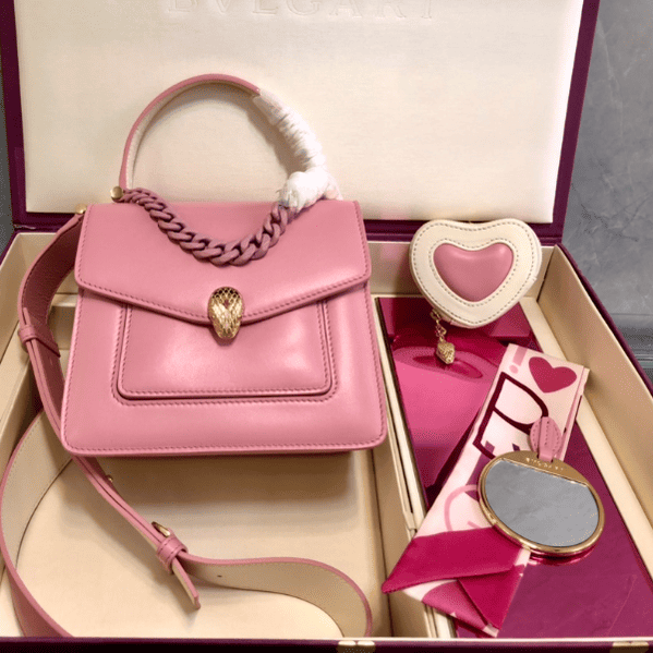 “Chinese Valentine’s Day” ❤️ special edition shines on the scene, with colorful handbags, exquisite coin purses and exquisite shawl gift sets, adding unique colors to the world of BVLGARI. This “SERPENTI FOREVER” series MAXI CHAIN handbag is small in size and has three compartments, with a detachable and adjustable leather shoulder strap. The pink heart-shaped print is embellished with ivory white lambskin on the inside, adding to the charming temperament. An interior mirror pocket, a front pocket, a back panel pocket and a customizable vanity mirror. An inner metal nameplate engraved with the BVLGARI brand logo. The “SERPENTI FOREVER” series heart-shaped coin purse is made of ivory opal white and flamingo pink lambskin, with a gold-plated brass chain for a stylish look. Paired with a small gold-plated brass SERPENTI snake head pendant, it also comes with a silk scarf!