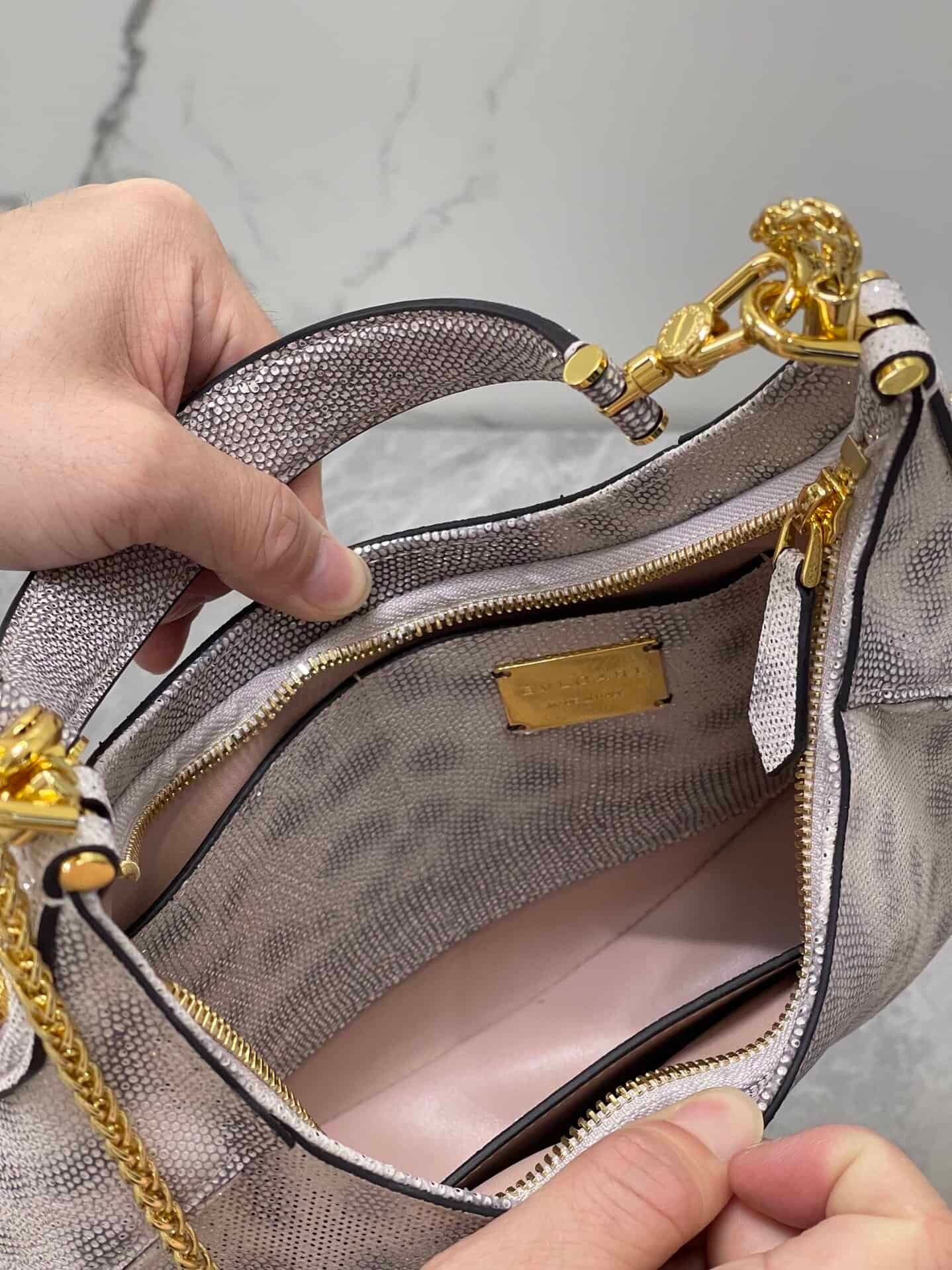 Featuring a single compartment, adjustable chain and leather shoulder strap and removable leather handle, it can be worn cross-body or as a classic shoulder bag. Practical top zip with an internal pocket, an external pocket on the back and BVLGARI metal logo.