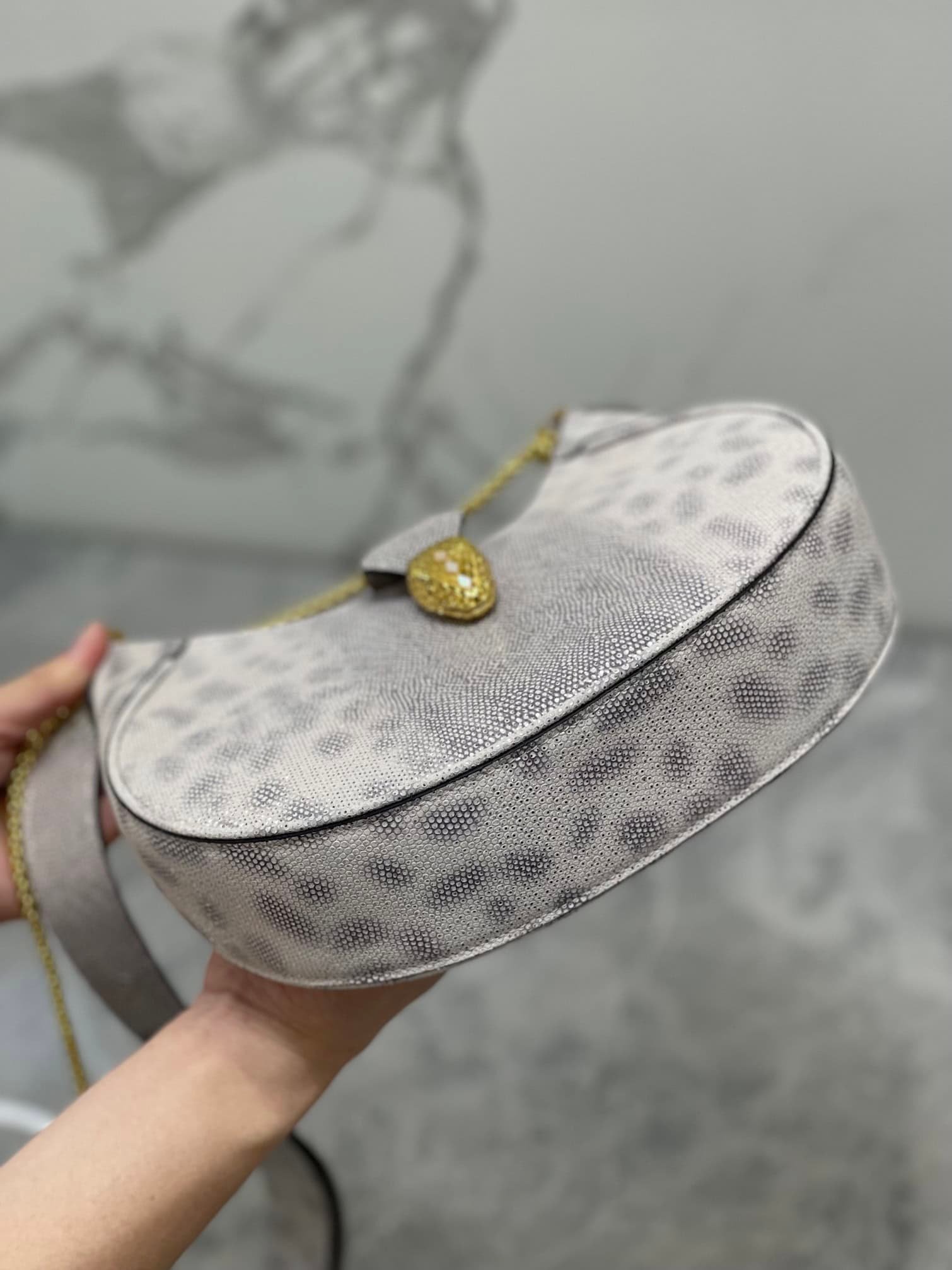 This everyday bag is crafted from silver-pink calfskin with a cowhide center and snake-print blue scales on both sides. It is paired with gold-plated brass accessories. The charming classic snake head is embellished with silver scales and pink enamel eyes in the center. The front magnetic buckle is hidden Under it.
