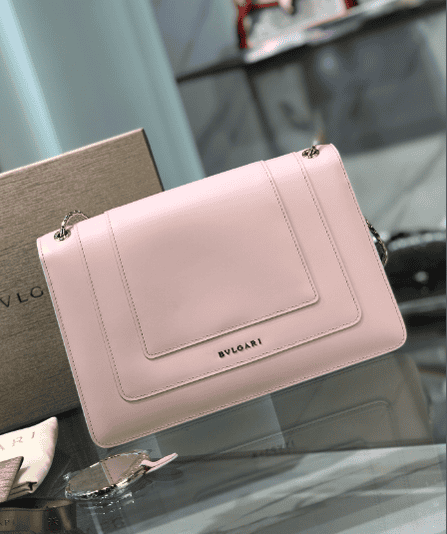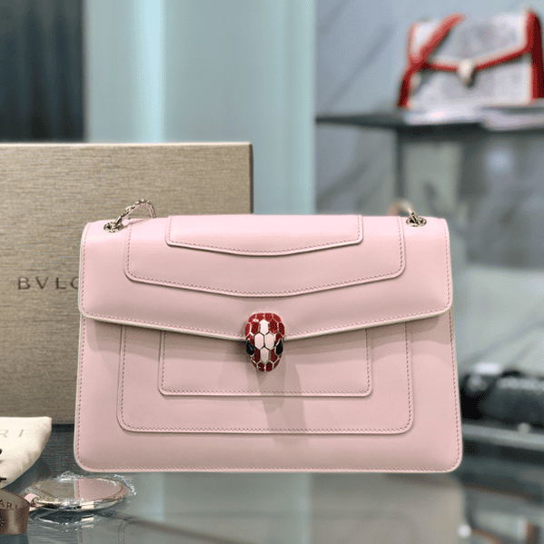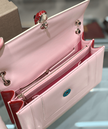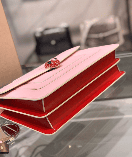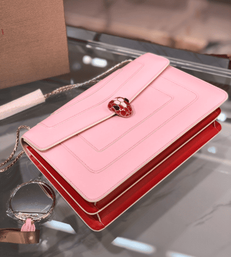 “Serpenti Forever” crossbody bag captures new color changes and is specially created to welcome the upcoming season. The bag is made of rouge jasper-colored smooth calfskin body and is decorated with ruby-colored smooth calfskin on the sides, demonstrating Bulgari’s expertise in using precious materials to create classic pieces. Ruby and rouge jasper enamel paired with sensual black onyx eyes embellished the classic snake head buckle in a charming way. The light gold-plated bag chain presents elements inspired by the winding snake body. It is paired with