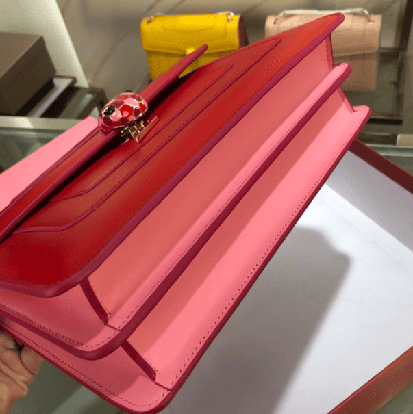 “Serpenti Forever” crossbody bag captures new color changes and is specially created to welcome the upcoming season. The bag is made of rouge jasper-colored smooth calfskin body and is decorated with ruby-colored smooth calfskin on the sides, demonstrating Bulgari’s expertise in using precious materials to create classic pieces. Ruby and rouge jasper enamel paired with sensual black onyx eyes embellished the classic snake head buckle in a charming way. The light gold-plated bag chain presents elements inspired by the winding snake body. It is paired with a small cosmetic mirror to make this bag more convenient and practical.