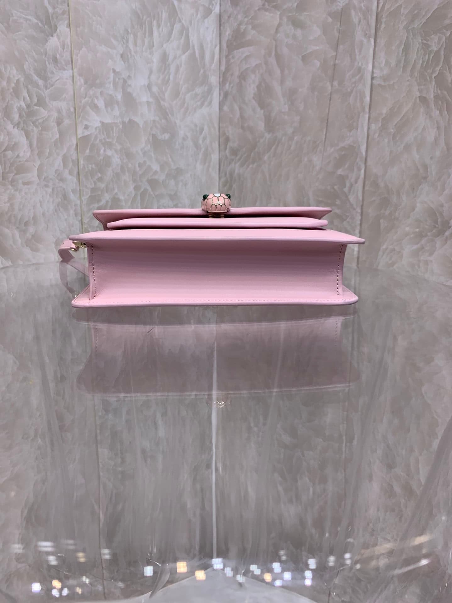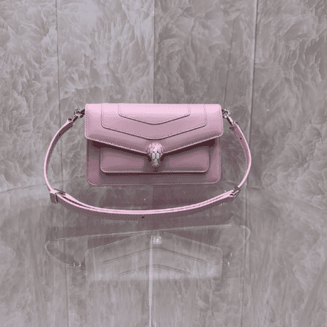 SERPENTI FOREVER EAST-WEST series small shoulder bag special edition is designed to pay tribute to the 520 festival and the power of love. It reinterprets timeless classics in a fashionable way and is made of flamingo quartz pink calfskin. The piece is paired with a practical leather shoulder strap and decorated with a classic snake head magnetic buckle. Its charming scales and design draw inspiration from the SERPENTI series of high-end jewelry in the 1960s. It is versatile and suitable for daily wear. It has a single compartment, a front pocket, a back spliced pocket, an interior quilted pocket, three card slots, a customizable vanity mirror, and a BULGARI metal logo on the back. Sold exclusively online.