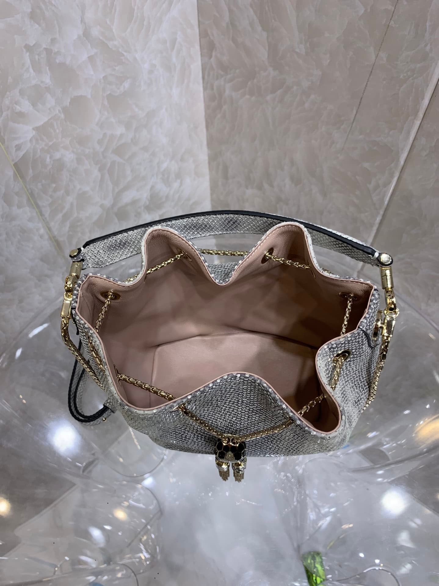 Bvlgari counter new limited edition bucket bag 🐍Snake skin model, made of imported snake skin lining lambskin. This style has a copper chain on the hardware that shuttles through the bag mouth and passes through the snake head hardware. There is a lock at the bottom of the hardware and can be contracted freely. Many European and American A must-have for big-name street photography🎉🎉
