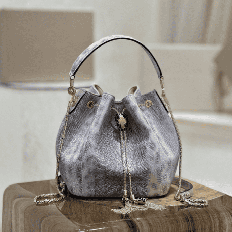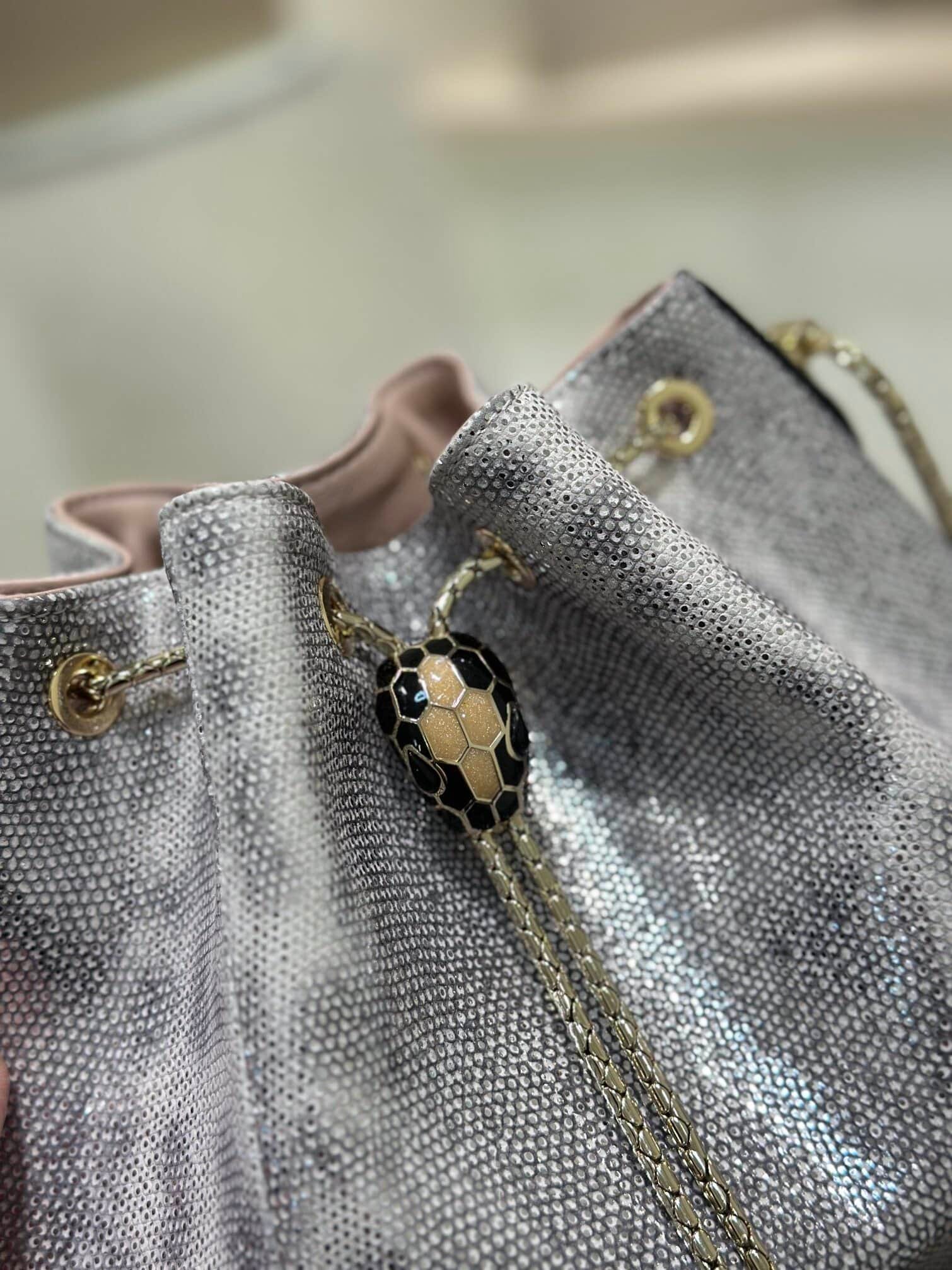 BVLGARI (Bulgari) Limited New Style – The same water snake skin bucket bag of the same style as Jolin Tsai, which is as beautiful as the sky🎉🎉The silver-pink color is like stars twinkling in the sky. Super shiny. The black snake skin has a snake head and The colors of the franc are so matching, more like a work of art. Which one do you like more [Love] [Love]
