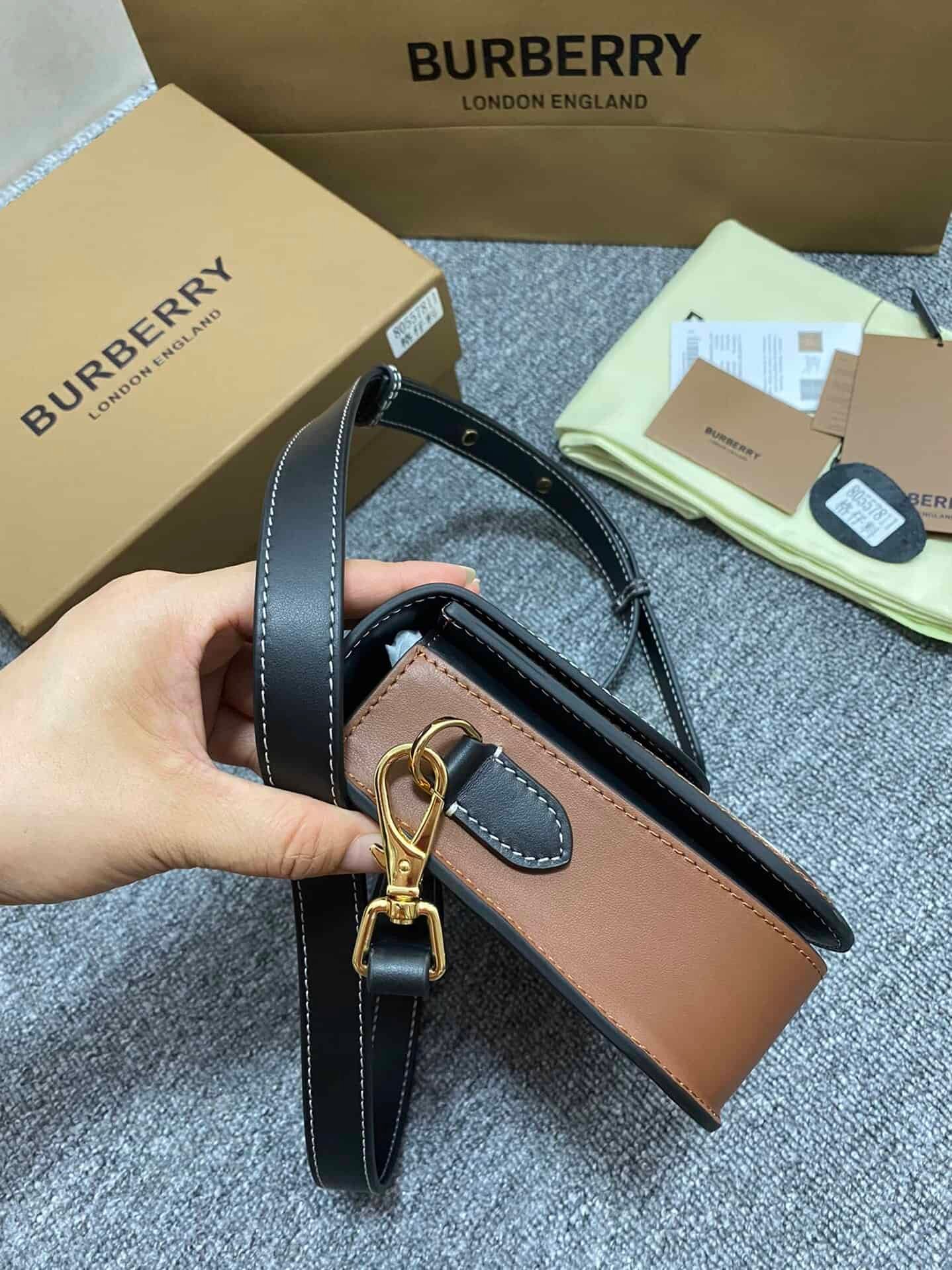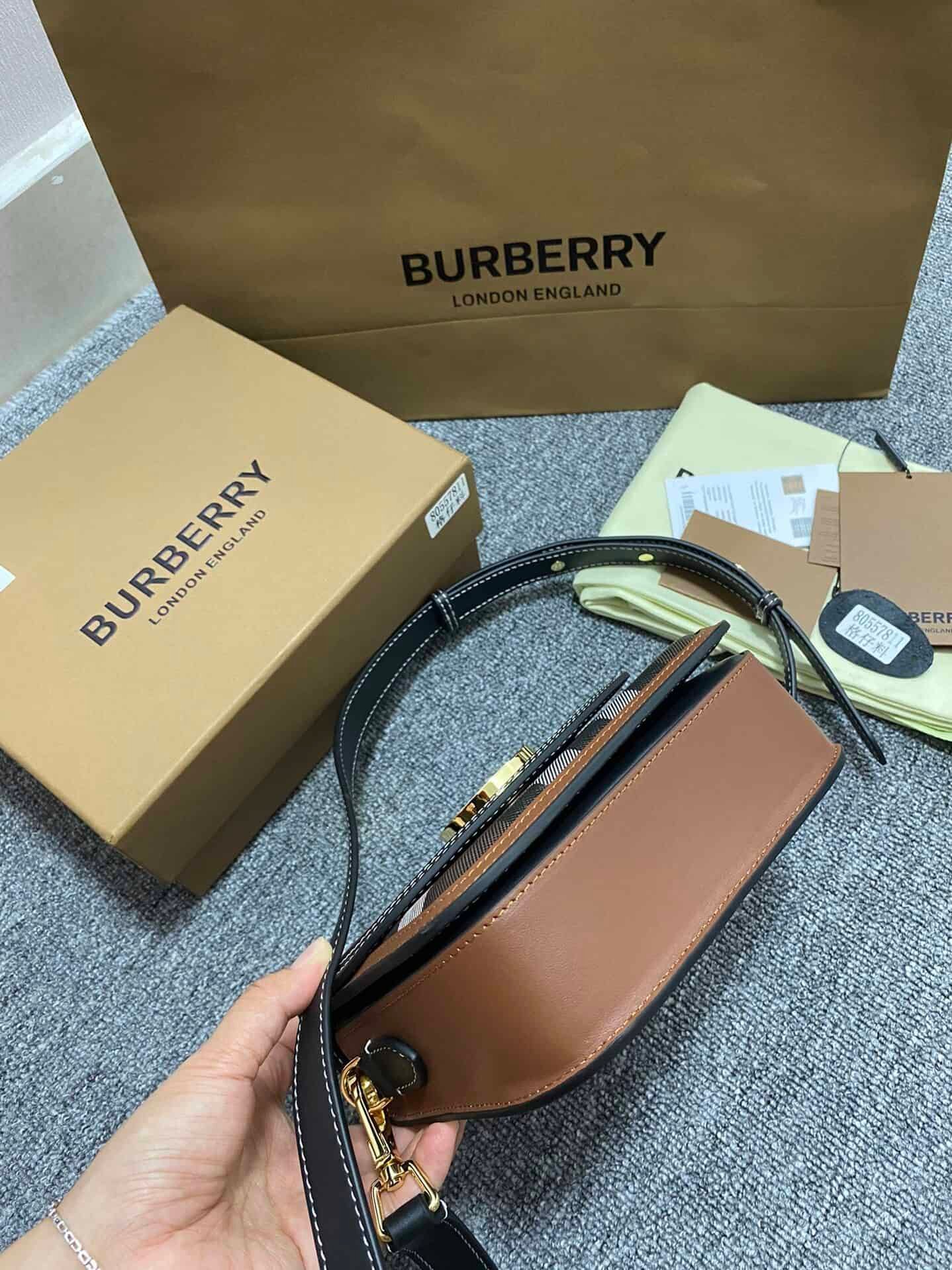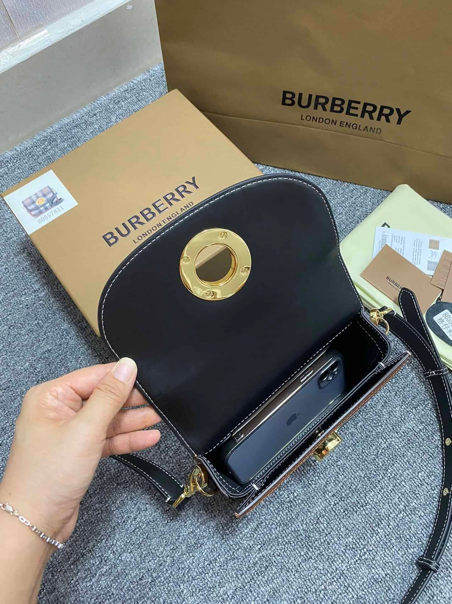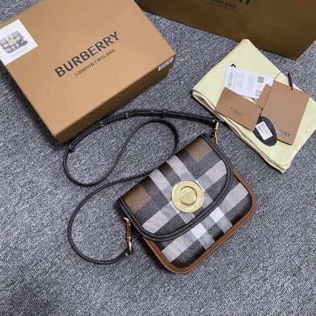 B’s latest crossbody bag, made of large checkered and topstitched leather materials, with a front panel design, highlighting the elegant arc. Finished with gold-plated logo eyelets and a glossy push-button in the shape of the brand’s logo. Paying homage to the brand’s history, the bag bears the names of founder Thomas Burberry’s mother, sister and eldest daughter. Carry it crossbody or over the shoulder using the detachable and adjustable strap.