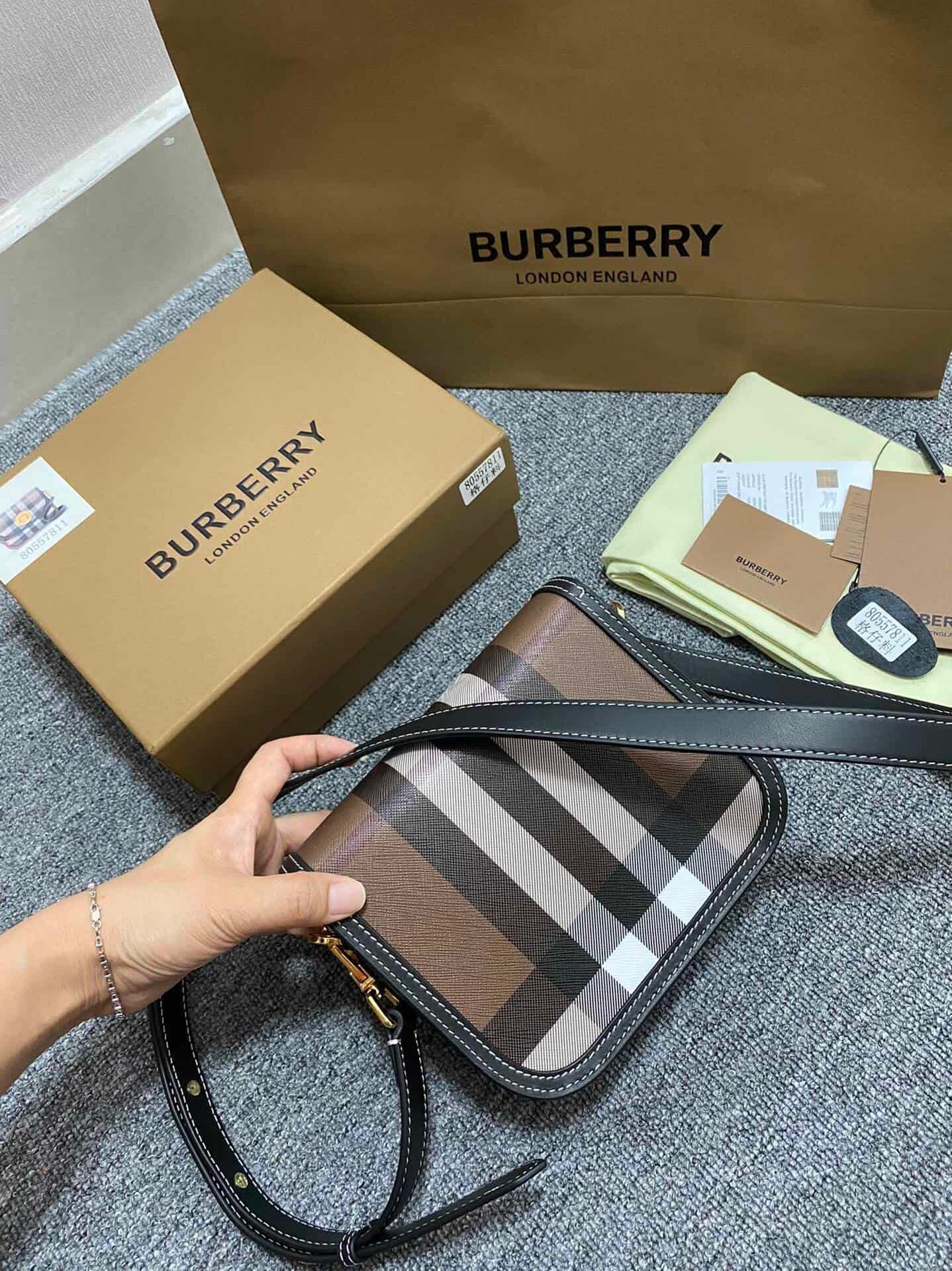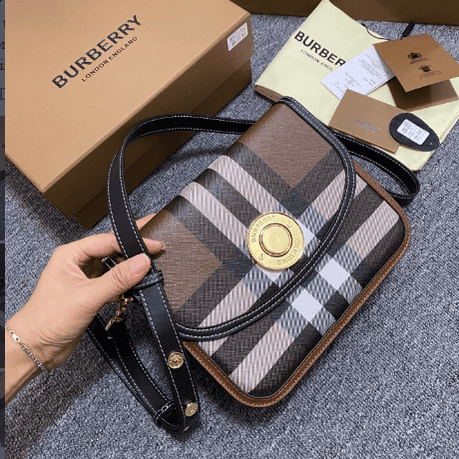 B’s latest crossbody bag, made of large checkered and topstitched leather materials, with a front panel design, highlighting the elegant arc. Finished with gold-plated logo eyelets and a glossy push-button in the shape of the brand’s logo. Paying homage to the brand’s history, the bag bears the names of founder Thomas Burberry’s mother, sister and eldest daughter. Carry it crossbody or over the shoulder using the detachable and adjustable strap. At least 30% of the main materials in this piece are bio-based. Bio-based materials are mainly derived from renewable natural resources such as plants and castor oil.