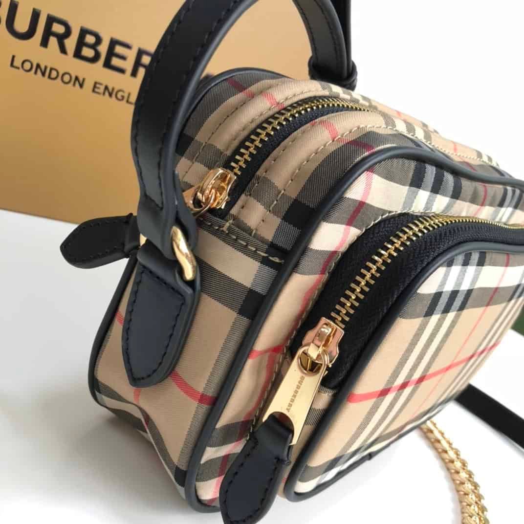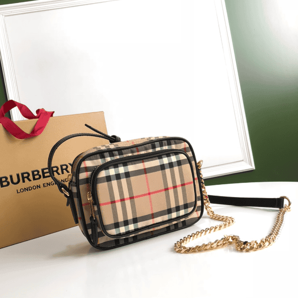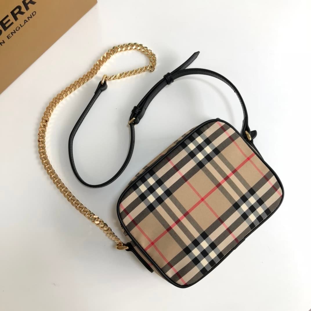 B’s exquisite camera bag, made of vintage cotton and leather materials, with straps with chain details. Wear it over the shoulder or adjust the straps to wear it cross-body.