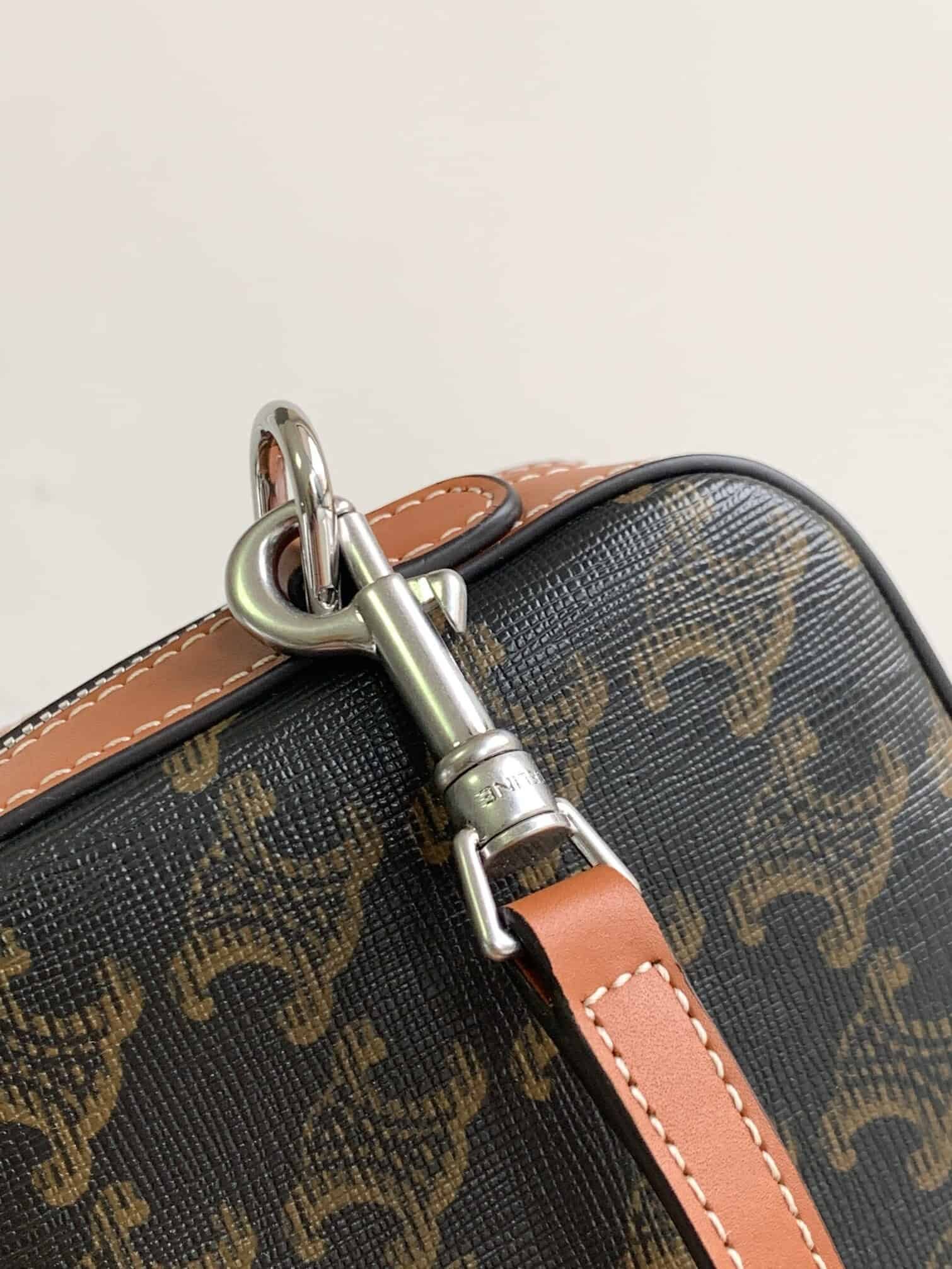 Logo print, cow leather binding, textile lining, cross body and shoulder carry, zipper closure, 1 main compartment, adjustable and removable leather shoulder strap, 50 cm long