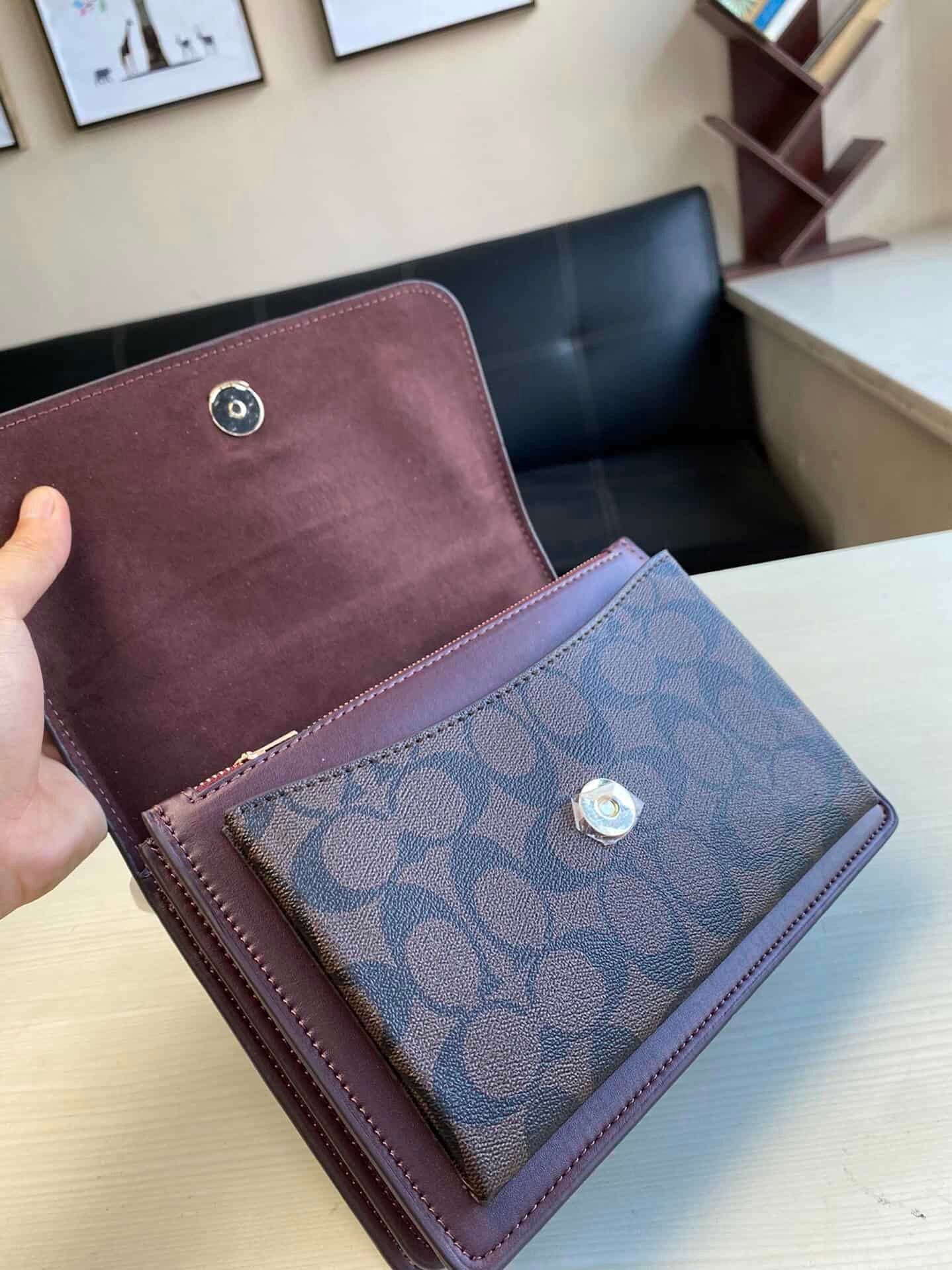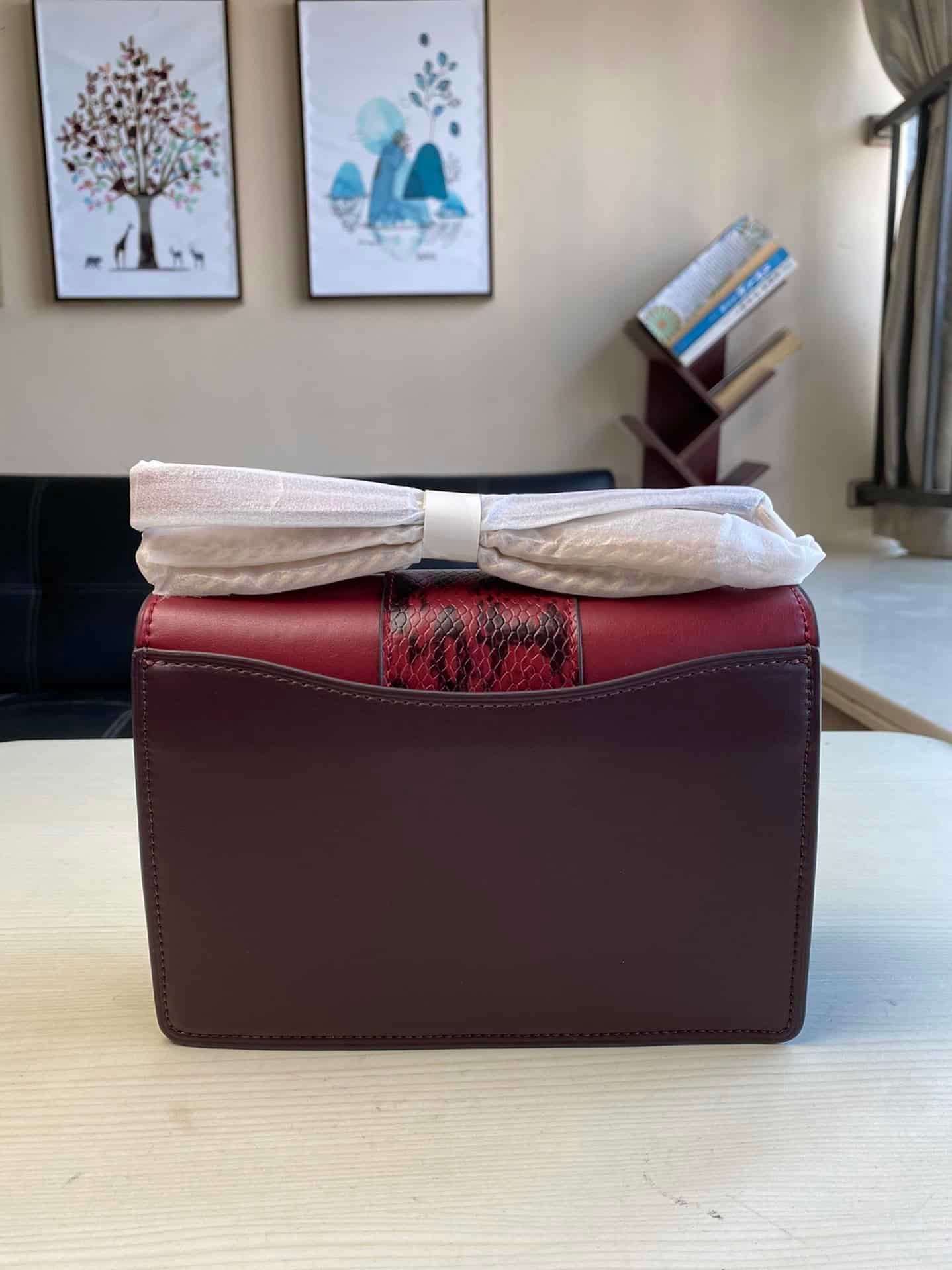 The accordion bag is dark red with snakeskin leather. A sophisticated and fashionable crossbody shoulder handbag.