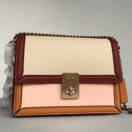 Hutton is made of refined calfskin, with twist-lock closure, retro hardware, fabric lining and a long sliding chain strap that can be worn on one shoulder and crossbody. This color scheme is amazing at first glance. It is lively and playful. The color scheme is special. Eye-catching