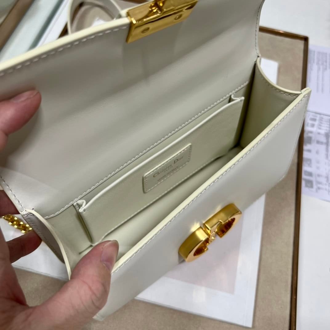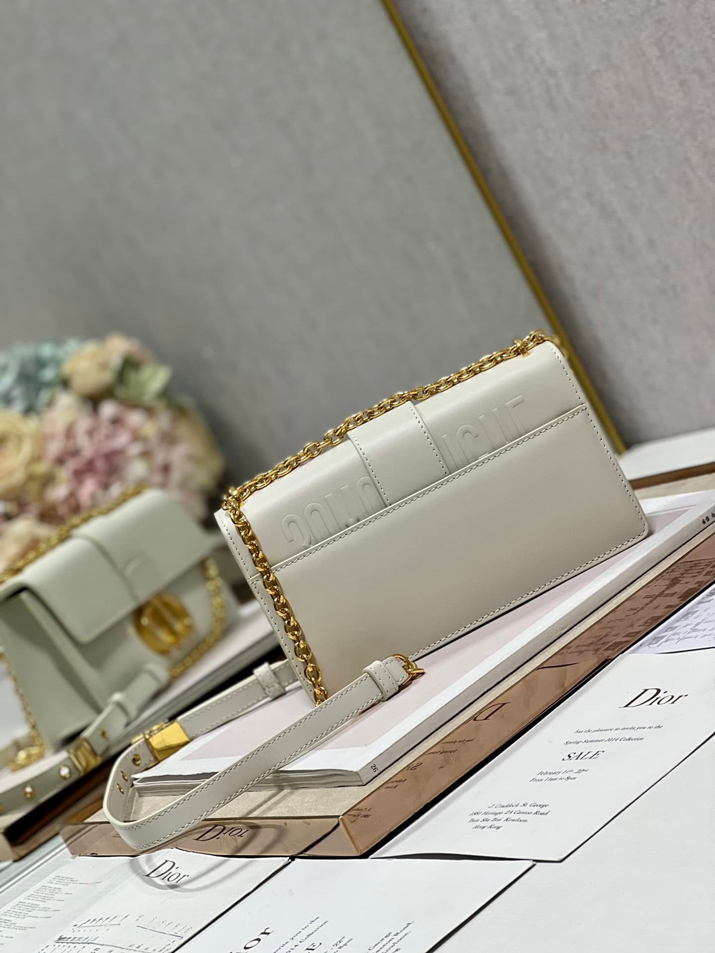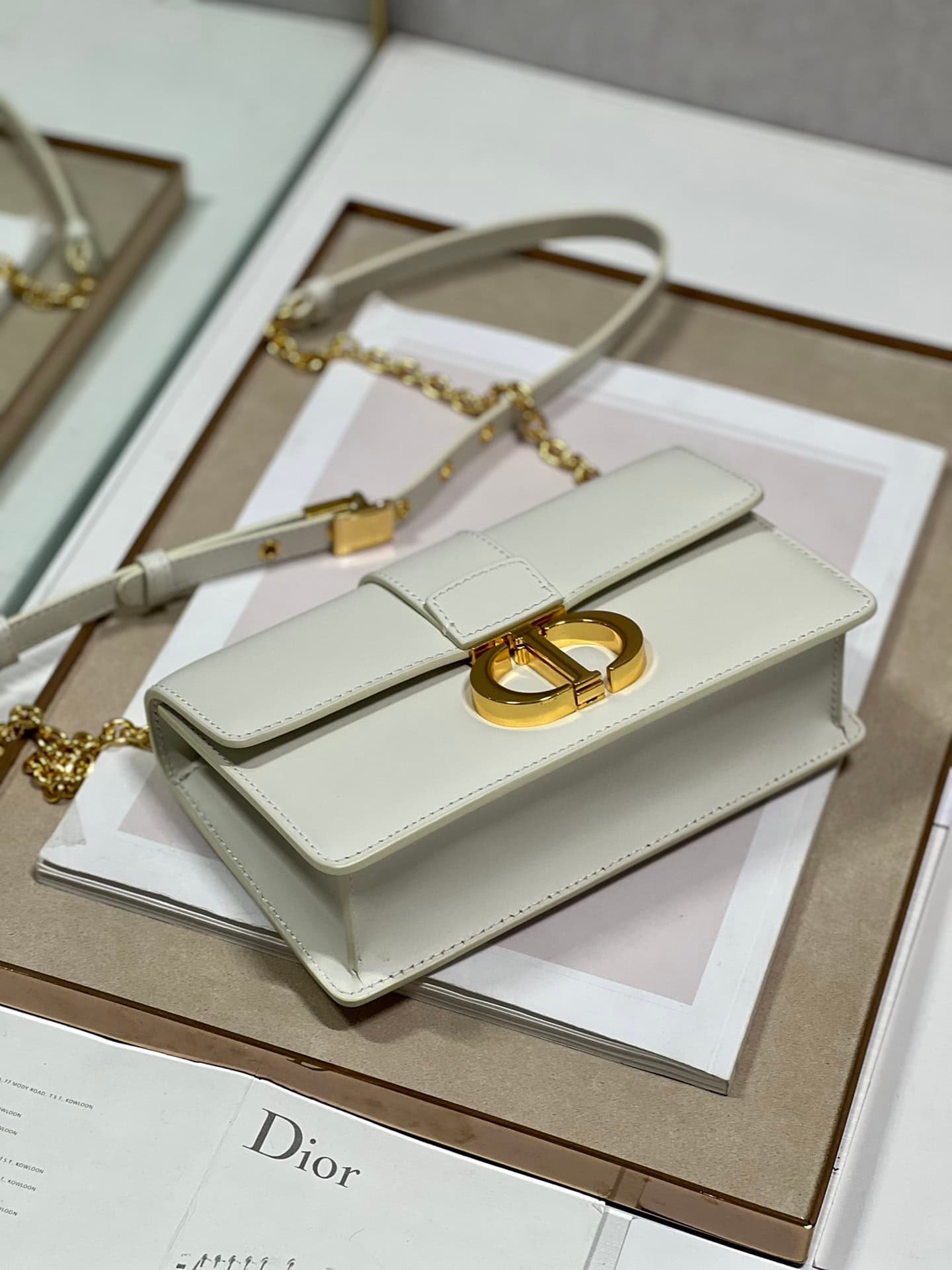 Crafted in smooth apricot calfskin, the timeless and elegant design elevates the collection. The flap is decorated with a metal CD clasp with antiqued gold finish, inspired by the closure of a Christian Dior perfume bottle. Additional details such as the 30 MONTAIGNE embossed logo on the back accentuate the clean design. With a detachable chain shoulder strap decorated with leather panels, it can be carried by hand, over the shoulder or cross-body. p128
