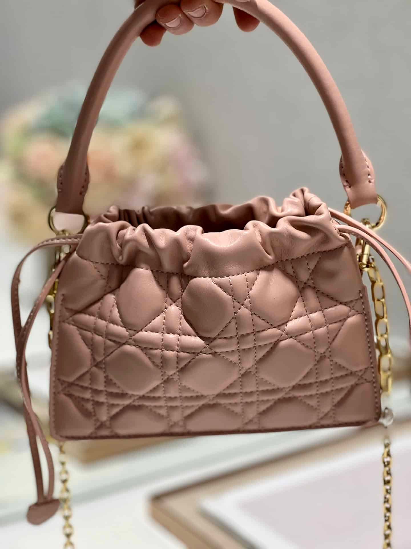 New this season is an elegant vintage-inspired mini bag with a top handle and drawstring that rounds out the Lady Dior collection. Crafted in white cannage lambskin, it features a DIOR charm and drawstring closure. With a detachable leather handle and detachable chain embellished with beads, it can be carried by hand or cross-body.