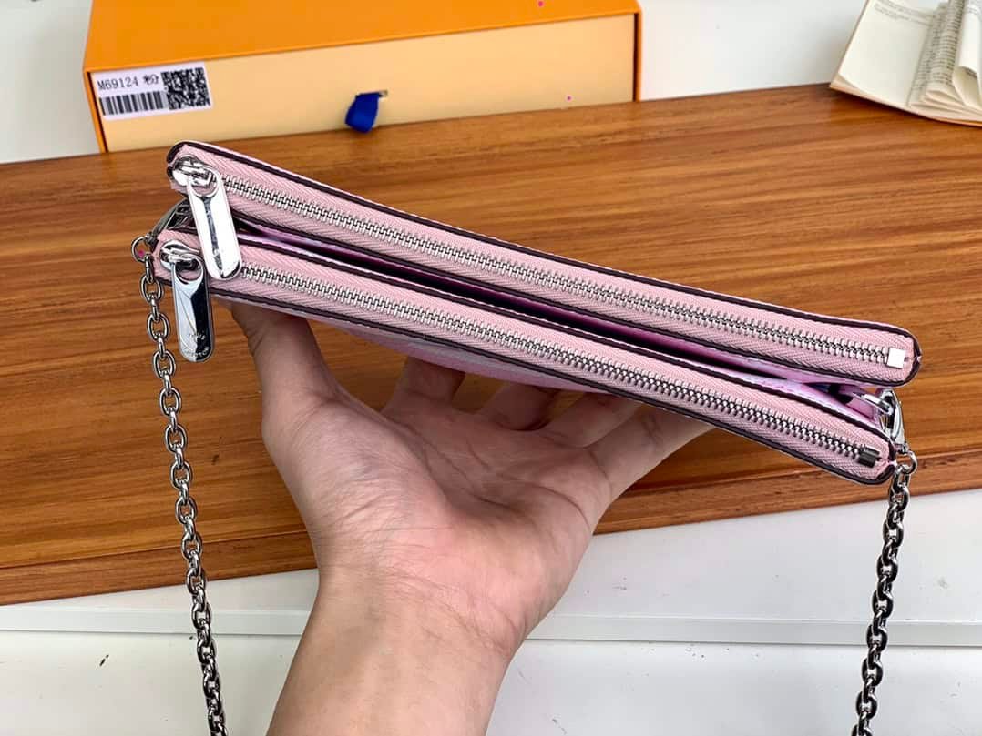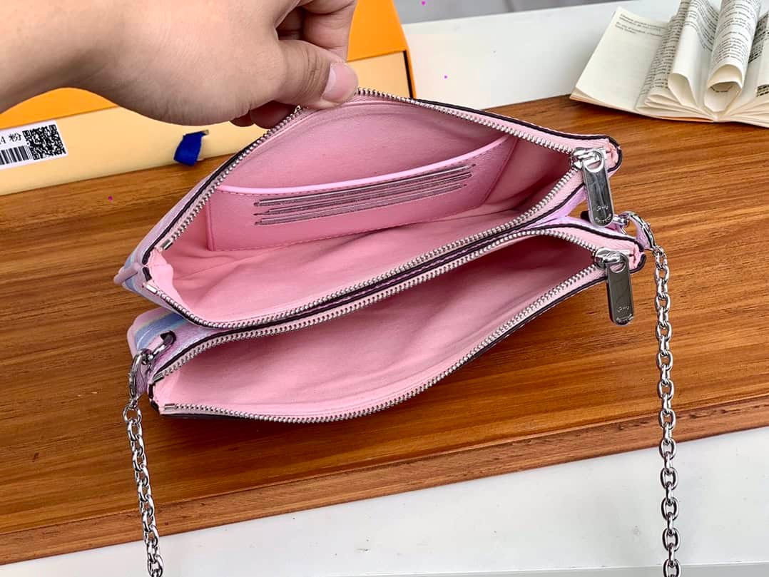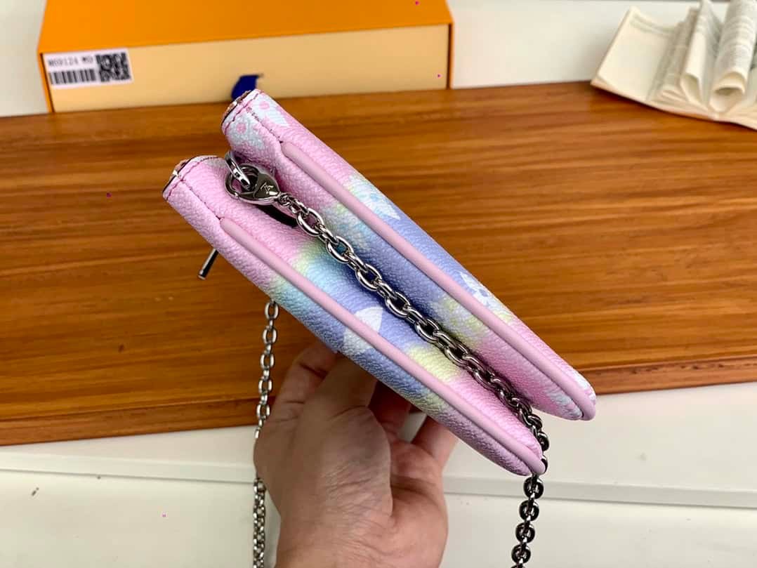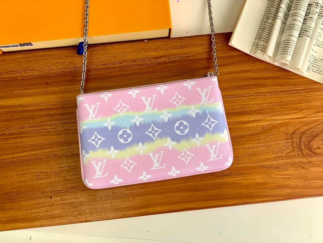 ESCALE POCHETTE DOUBLE ZIP CLUTCH Summer 2020 Escale accessories and leather goods collection presents a special edition Pochette Double Zip clutch. The tie-dye printing depicted on the surface of Monogram Giant canvas conveys the beauty of traditional twist-dyeing process, and the pockets and detachable chains inject flexibility.