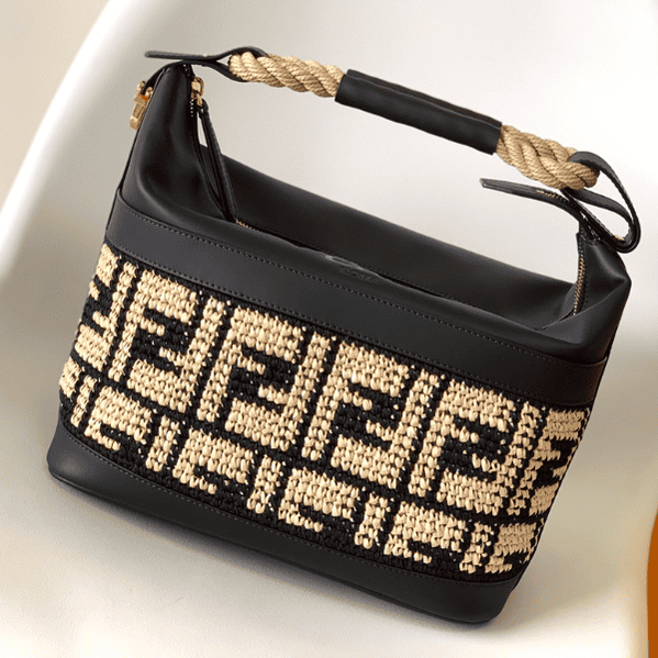 Insulated bag with handle and zipper. Handwoven beige raffia with black FF pattern. Details are trimmed in black leather. Braided rope handle. Gold finish metal hardware