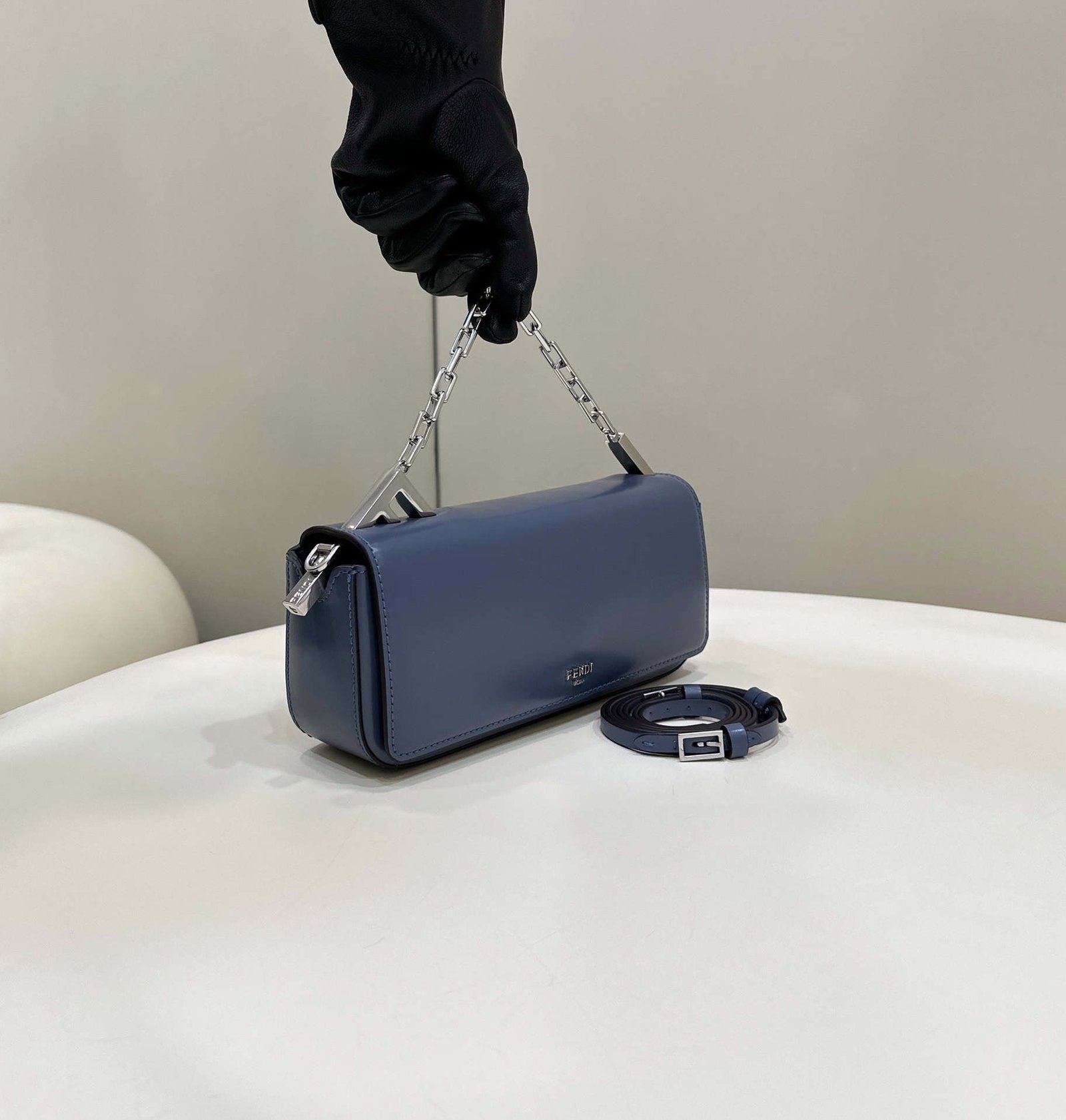 FENDI First Sight handbag in full leather with large F motif metal hardware and chain, leather interior in matching tones, with handbag mirror and 2 pockets, with antique silver-tone hardware, short chain handle, can be hand held or portable