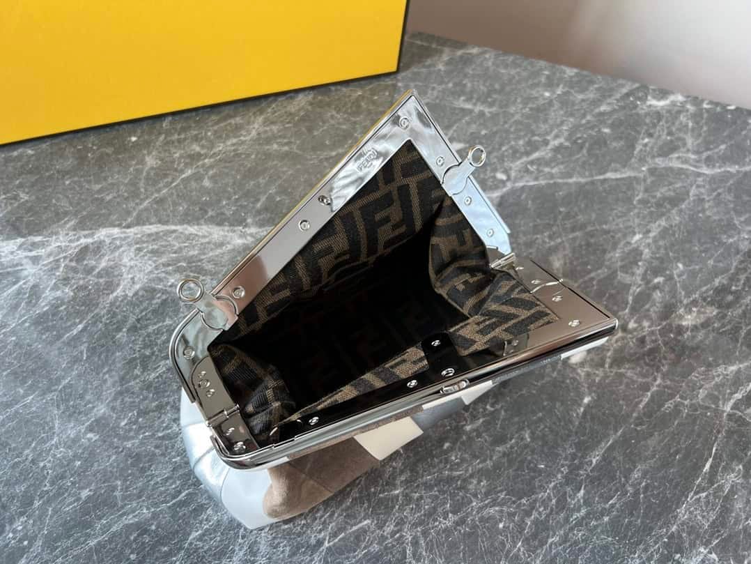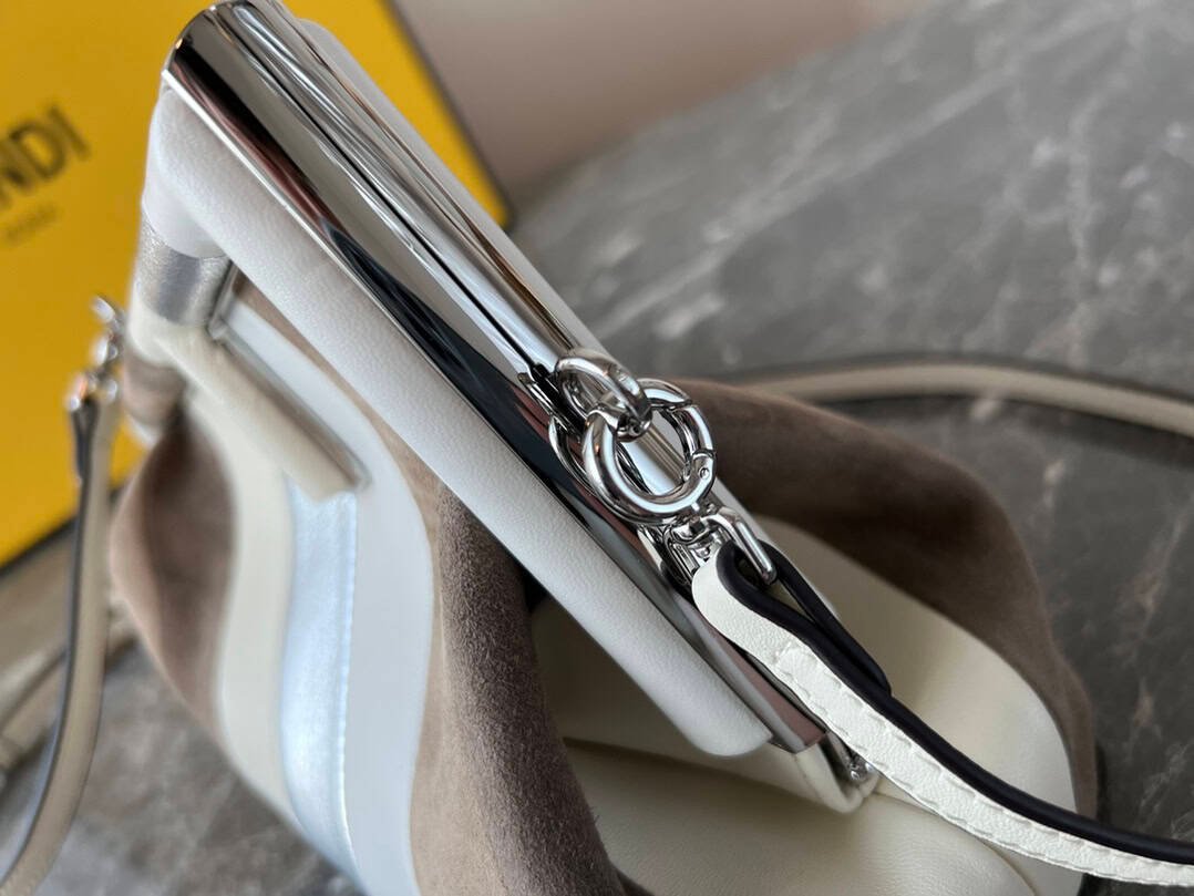 FEND1 First small handbag handcrafted from inlaid leather, laminated leather and suede in a silver and light brown diagonal stripe pattern. Oversized F metal buckle with matching graphic band. Fabric-lined interior compartment printed with signature FF pattern, with removable internal hook closure and palladium-plated hardware. The bag has a detachable shoulder strap that can be carried by hand or on the shoulder. made in Italy