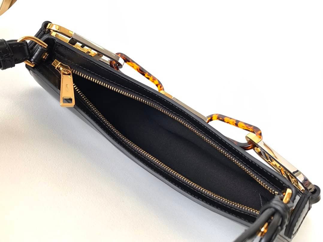 Fendi O’Lock Swing presents the retro feeling just right. It can be recklessly concave shape. It can be held in hand, on one shoulder, cross-body, or under the arm. It is matched with two short shoulder straps: one short acrylic chain Strap, a short full leather strap. It can be freely detached. It is unique. The bag capacity is also very strong. It meets daily needs.