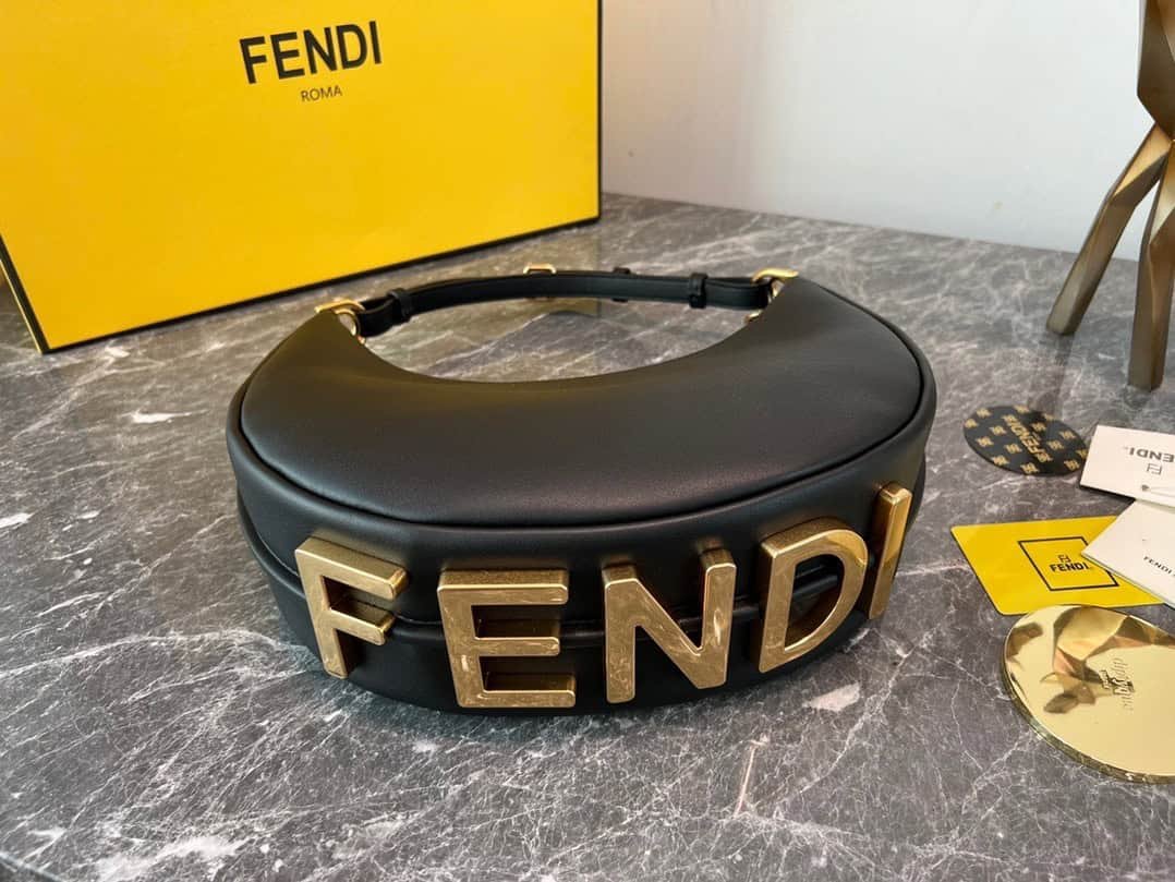 FEND1praphy underarm bag, featuring a crescent moon shape, with the classic metal large Logo [FEND1] decorated on the bottom of the bag, the outline of the bag is very suitable for the body line, full of fashion sense when carried under the armpit, simply It’s a walking lawn grower!