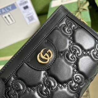 GG matelassĂ© leather shoulder bag continues to stand out in a unique way. With an ultra-soft finish, the iconic material is once again reimagined as part of the Gucci Love Parade, with a textured geometric pattern. The design presents a contemporary approach to the ’90s logo trend that appeared in House’s latest collection. Here, it comes in a minimalist shade of black. Black GG matelassĂ© leather with double G gold hardware.