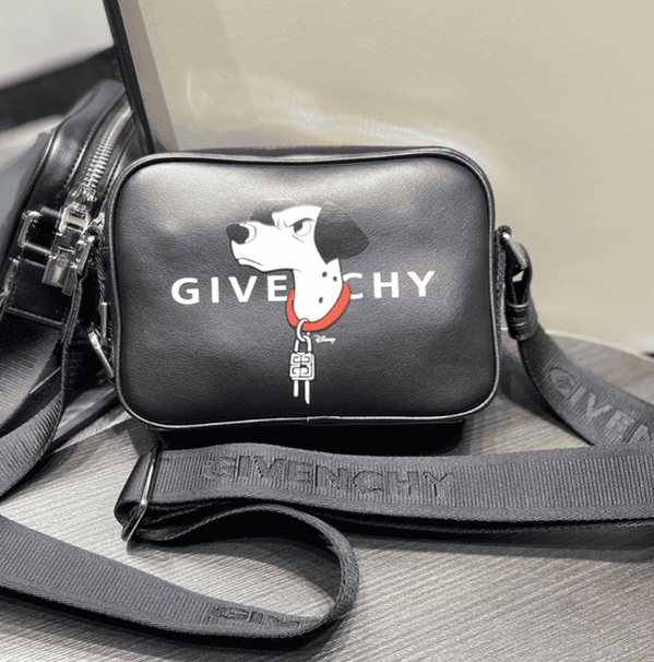 Givenchy x Disney joint model “101 Dogs” pattern G-Essentials camera bag made of cowhide, cloth lining, 4G logo zipper puller, zipper closure. The front of the bag is decorated with GIVENCHY letter print and the “101 Loyal Dogs” pattern. There is an external flat pocket on the back and a flat pocket inside; Givenchy Logo adjustable jacquard canvas shoulder strap, suitable for men and women.