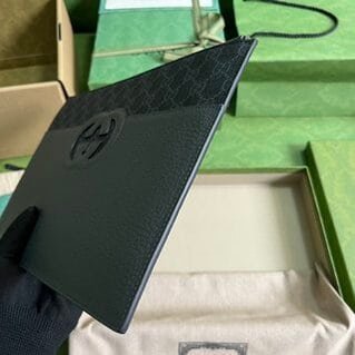 Decorated with hollow interlocking double G storage bags. This pouch is embellished with the interlocking G detail in perforated leather and GG Supreme canvas for an accessory that is as contemporary as it is timeless. Since its inception in the 1960s, the iconic interlocking double G logo has been an integral design element in all Gucci collections. The logo is derived from the initials of the brand’s founder, Mr. Guccio Gucci, and has been continuously reinterpreted in various forms and styles. Black and gray GG Supreme canvas, gray leather trim, moiré fabric lining, interlocking GG cutout detail, interior: 4 internal card compartments and 1 external flap pocket, wrist strap (12 cm high).