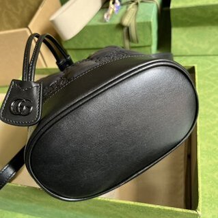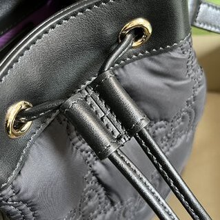 GG MatelassĂ© bucket bag. The reimagines the GG design, and we’ve launched a range of bags marked by textured quilted patterns, including this black bucket bag. Double G hardware embellishes the front, injecting brand identity connotation into the whole design. Black GG MatelassĂ© nylon with black leather trim, black brass hardware with ceramic-effect finish, two detachable shoulder straps: black nylon and black leather, double G, double shoulder strap; leather shoulder strap 60 cm high, canvas shoulder strap high 53 cm, fastened with drawstring