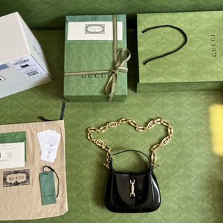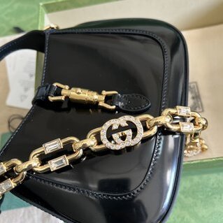 Jackie 1961 series mini shoulder bag, this single product is made of dazzling patent leather, which is playful and delicate. This Jackie 1961 series mini handbag interprets this glossy material in bright black, adding a stylish masterpiece to the “Gucci Love March”. Bold color palettes echo this season’s show’s homage to self-expression. Black patent leather, gold-tone hardware, high handles: 10 cm, detachable interlocking G chain shoulder strap with crystals (40 cm high), push-lock closure.