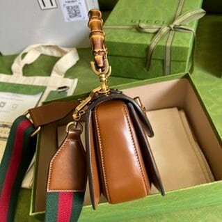 Original leather bamboo handle small handbag Gucci’s “Aria-Fashion Aria” series uses modern techniques to reinterpret classic elements. Bamboo is one of the classic elements of Gucci, which has appeared in various series of the brand since the 1940s. After more than eighty years of evolution, this classic element has been reinvented in black leather on this small tote. The handbag is also equipped with two interchangeable shoulder straps – the smooth leather material shows elegant and classic temperament, and the striped webbing shoulder strap shows a strong brand connotation.