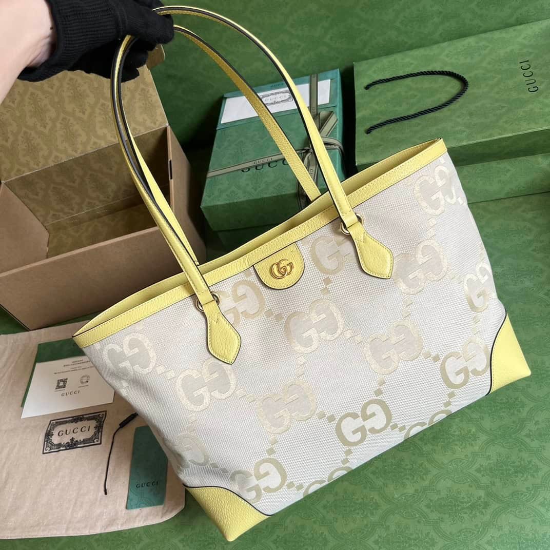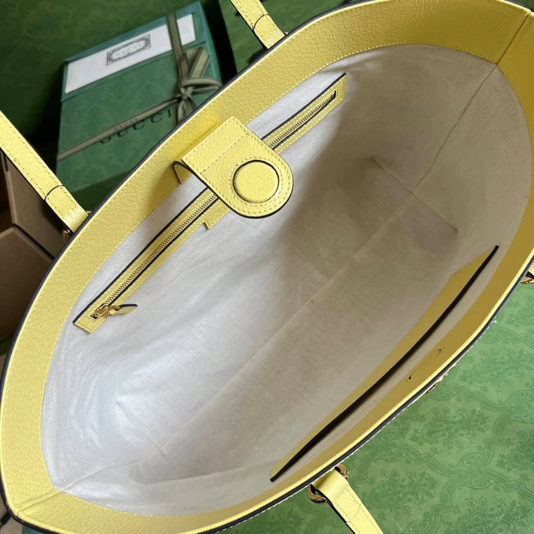 With a full set of original green box packaging Ophidia series super double G medium tote bag, Ophidia series launched a new beige and banana yellow canvas tote bag, enriching the aesthetic narrative with retro details. This tote bag has a soft, structured shape and is crafted from Super Double G canvas, with Double G-shaped accessories that vividly present the classic Gucci belt buckle design from the 1970s in a fashionable perspective. Beige and banana yellow Super Double G canvas with banana yellow leather trim, Gold tone hardware Double G, inside zip pocket, double leather handles 25 cm high, 54 cm long, magnetic snap closure, weight: approx. 0.71 kg.