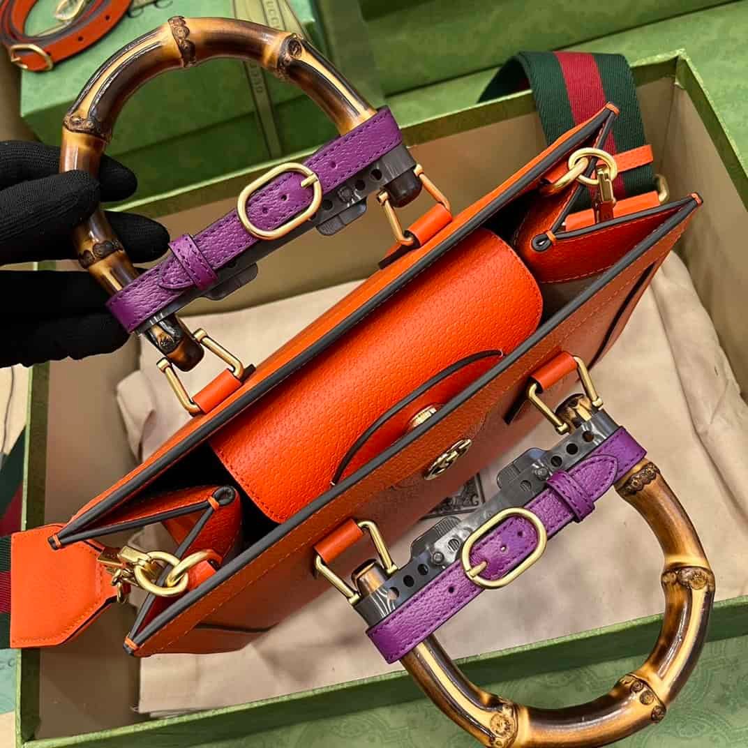 With a full set of original green box packaging The original leather bamboo handle medium handbag Gucci’s “Aria-Fashion Aria” series uses modern techniques to reinterpret classic elements. Bamboo is one of the classic elements of Gucci, which has appeared in various series of the brand since the 1940s. After more than eighty years of evolution, this classic element has been updated with orange leather on this small tote. The handbag is also equipped with two interchangeable shoulder straps – the smooth leather material shows elegant and classic temperament, and the striped webbing shoulder strap shows a strong brand connotation.