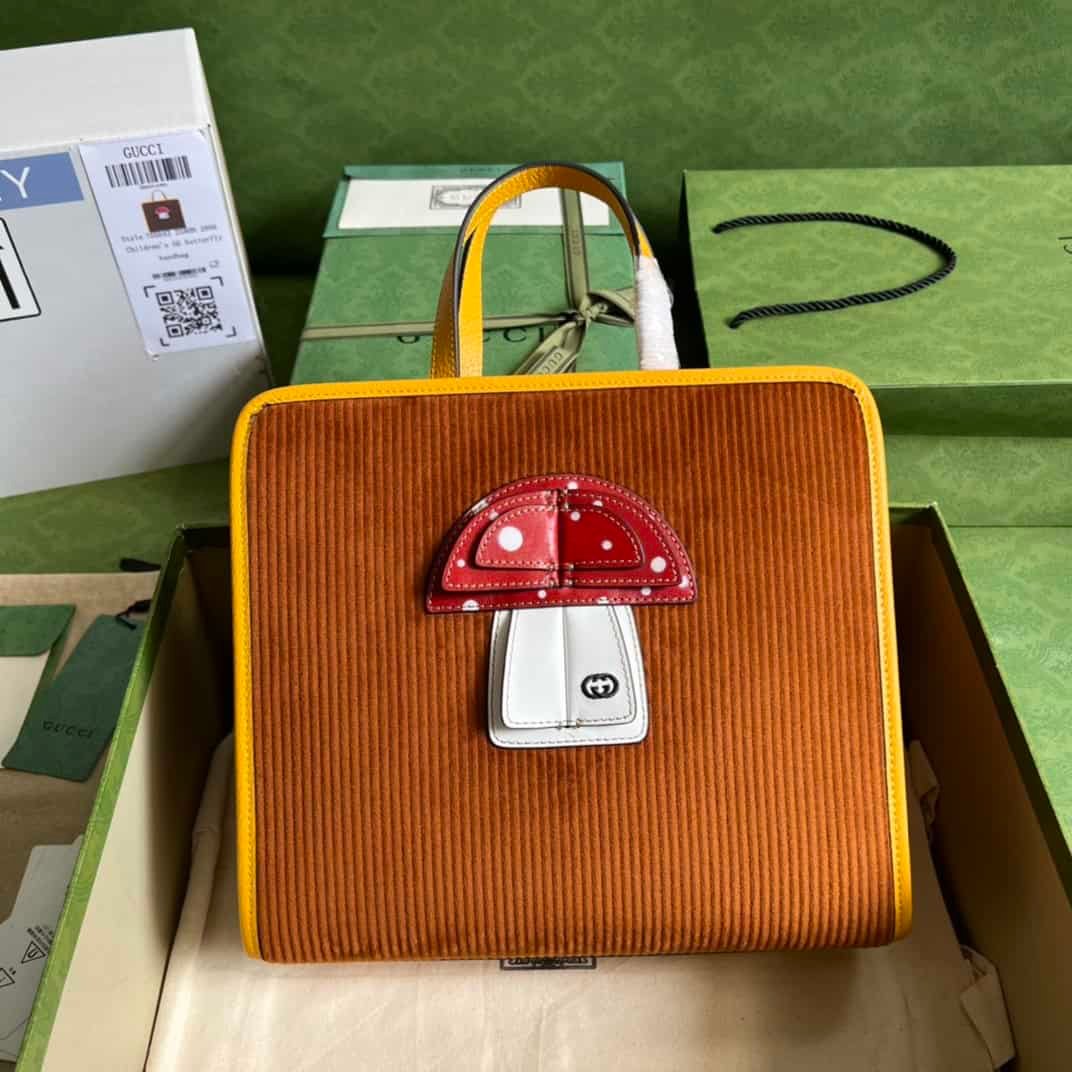 With a full set of original green box packaging Children’s Mushroom Tote Bag, this children’s tote bag is cleverly integrated with three-dimensional mushroom pattern details, which reminds people of the natural beauty of quiet woodlands and vast forests. Hide details, dark olive corduroy Leather mushroom patch with Interlocking G embroidery, interior open pocket, double handles, magnetic snap closure.