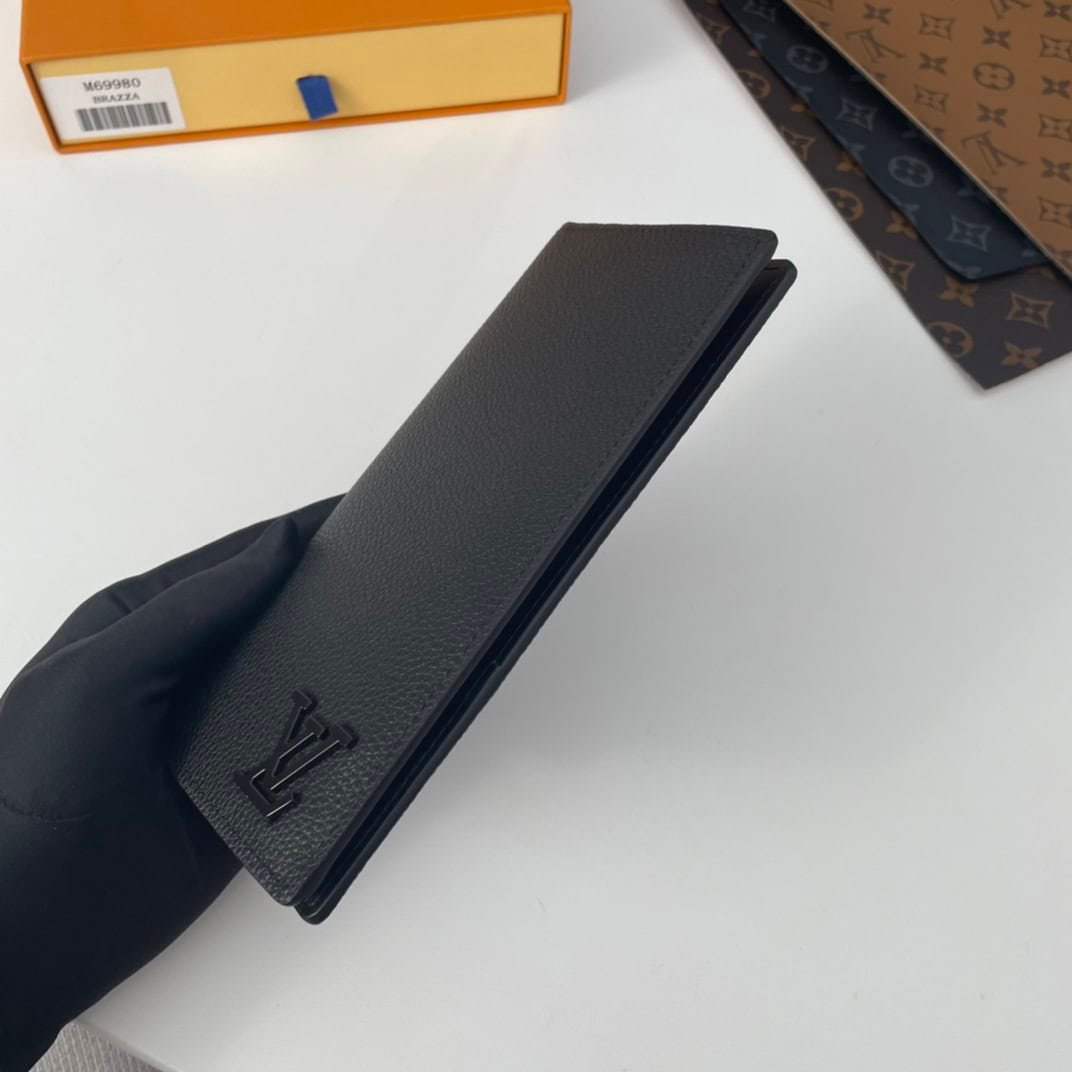The new LV Aerogram Brazza Wallet embodies the delicate texture of heavy-grained calfskin, and the identity is subtly branded with metal LV letters. Compartments and card slots can hold bills, documents and coins, matching LV Aerogram handbags.