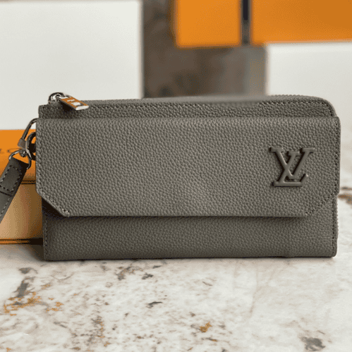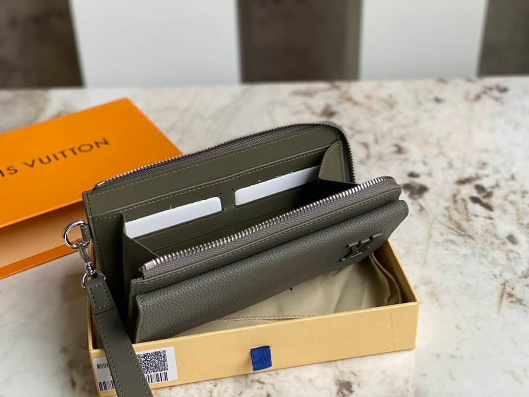 Full leather wallet handbag series This new LV Aerogram long wallet reinterprets traditional men’s accessories with a contemporary and simple design. The style is made of grainy black calfskin, which is as soft as the historic aerogram. The wallet is roomy with an accordion-style main compartment, 12 credit card slots, and additional flap pockets to hold different items.