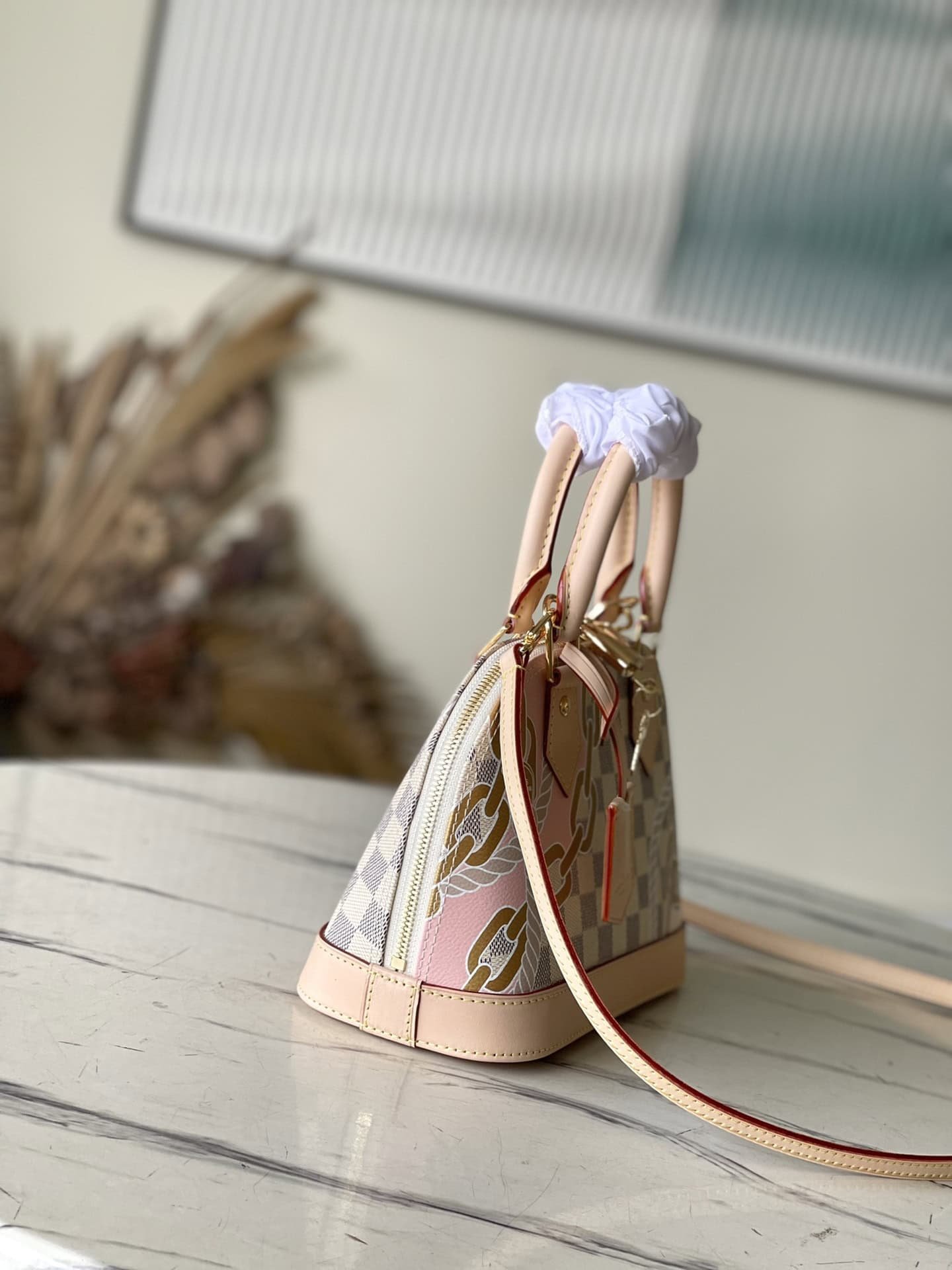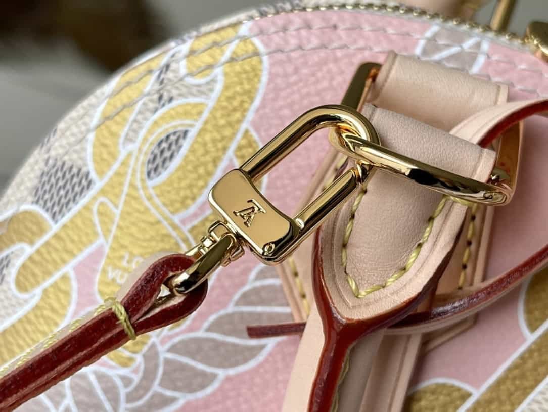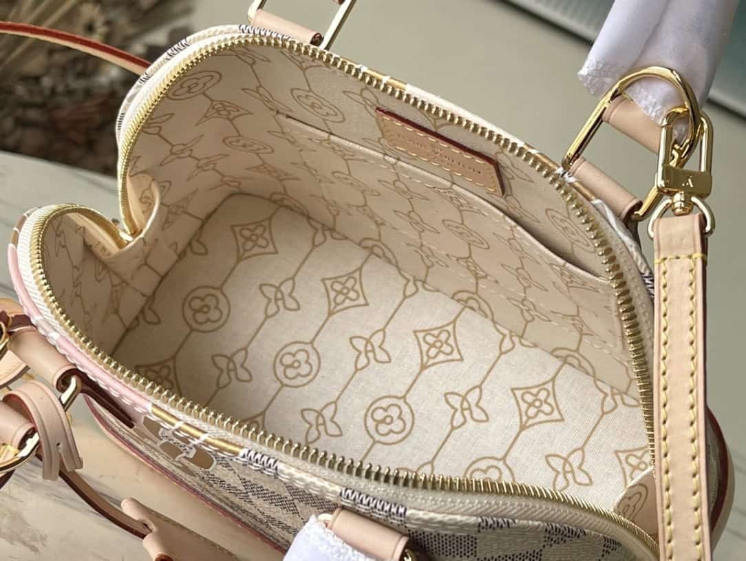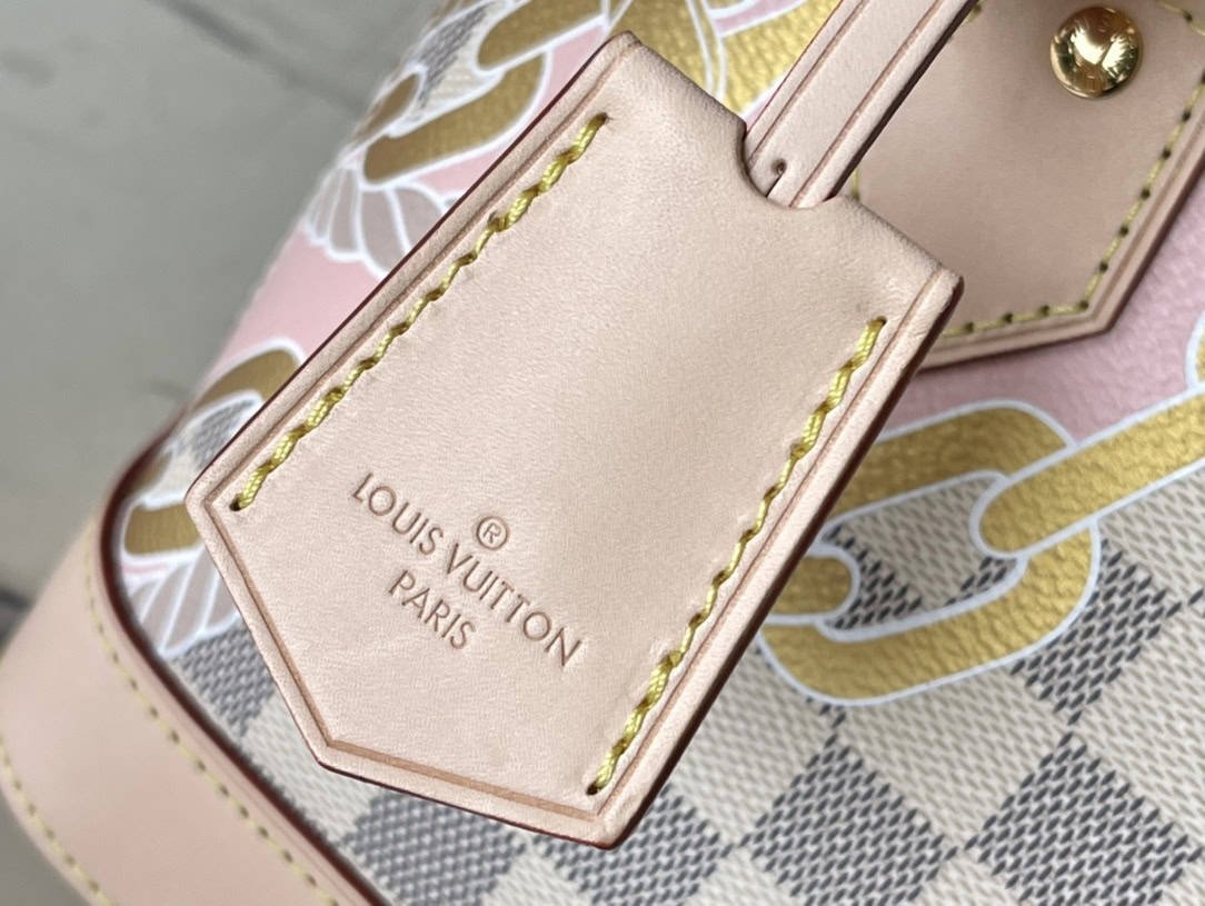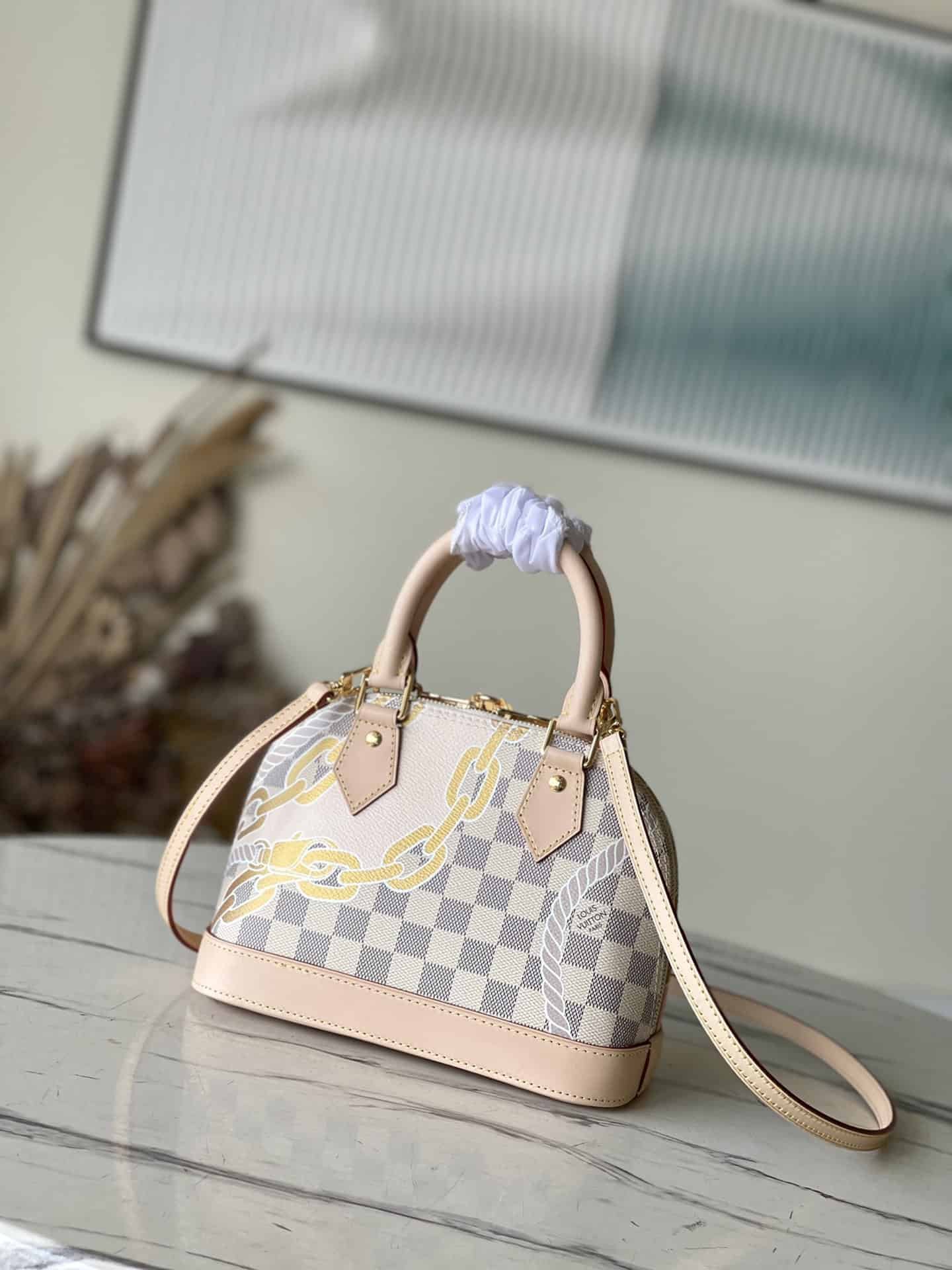 Screen Printing This Alma BB handbag depicts nautical prints composed of rope and chain patterns on Damier Azur canvas, renewing the Art Deco silhouette. The top handle and detachable and adjustable shoulder strap allow for versatile carrying options for beachside getaways in the Hamptons.
