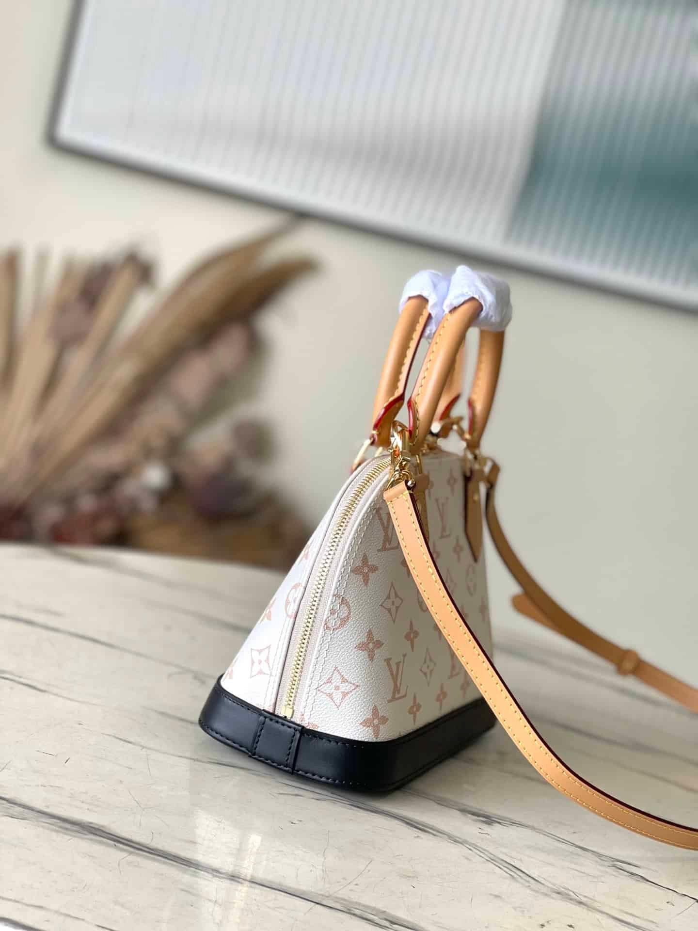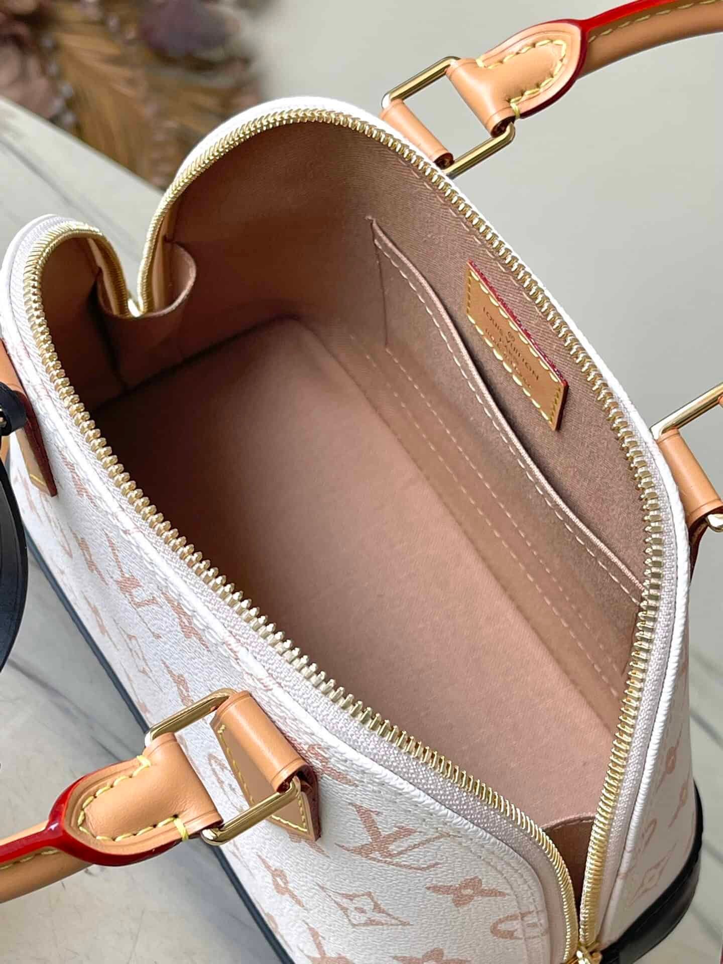 White flower brand new single Doon canvas, integrated with modern “Alma BB”. The cowhide trim accentuates the beige tones, with fungus leather accents on the handles and straps, and black on the bottom of the bag and keychain. 2 top handles and removable strap allow for a variety of styles.