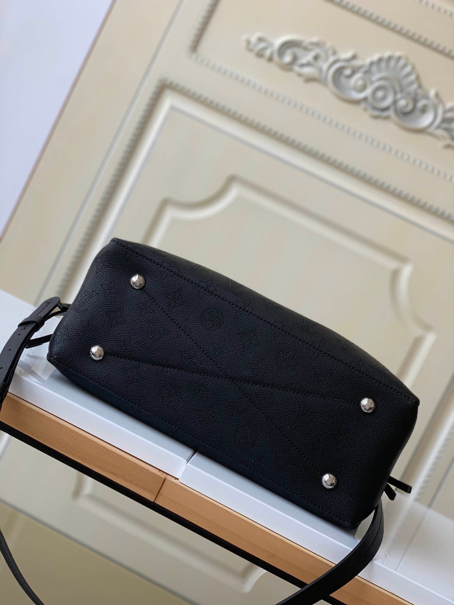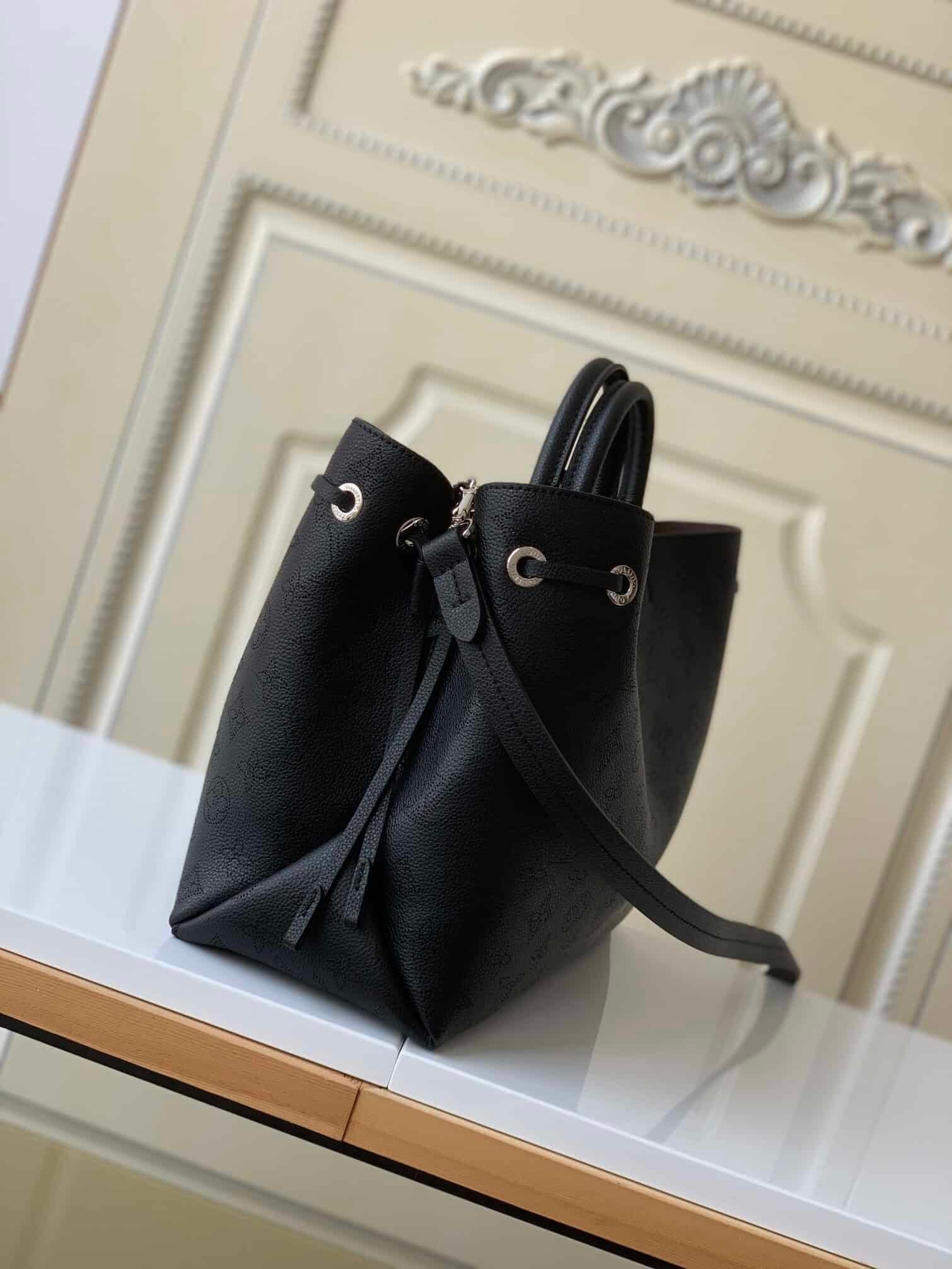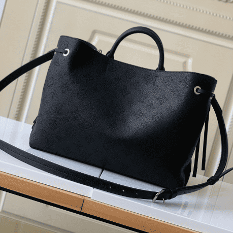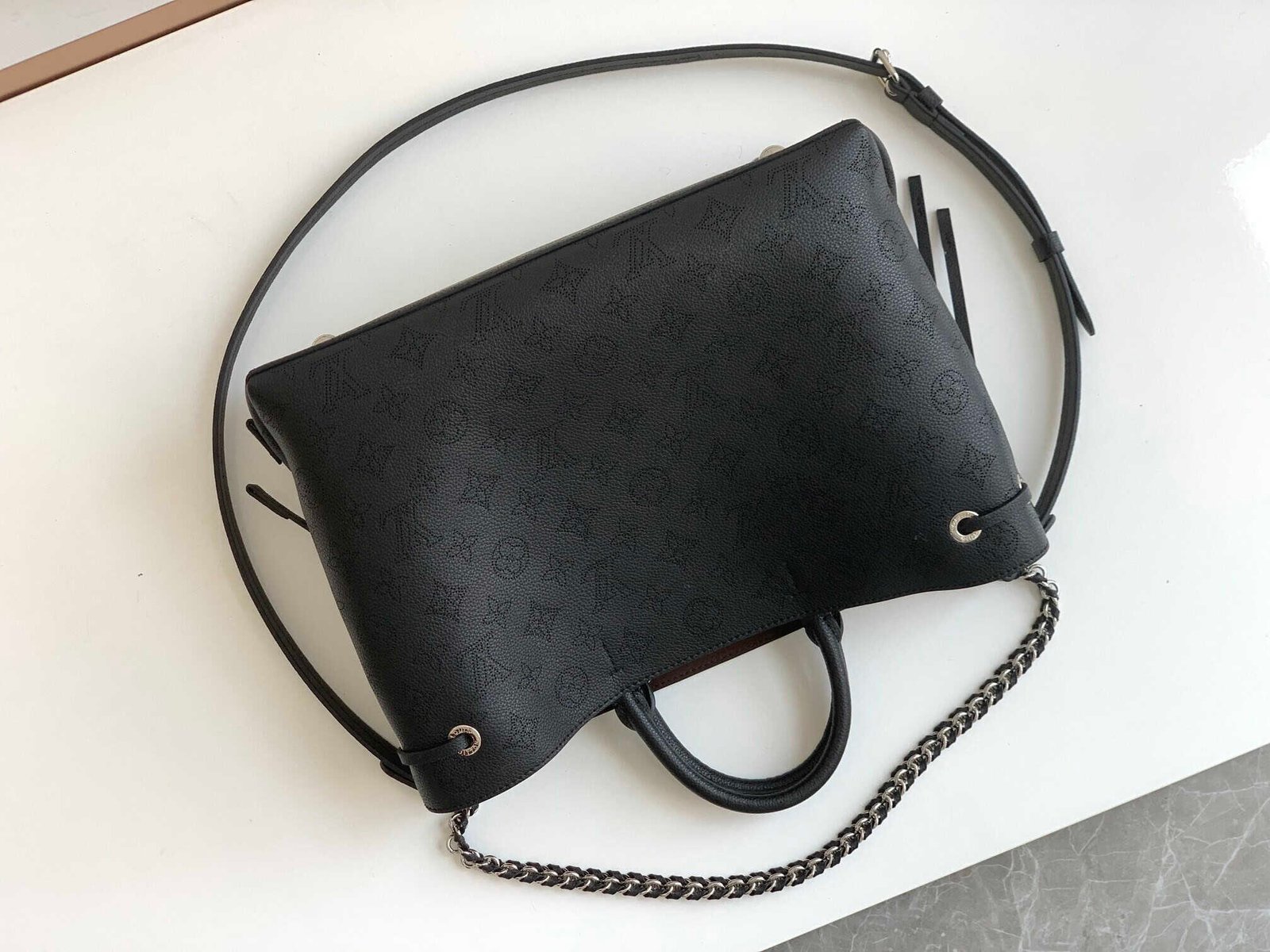 Bella Tote handbag is made of soft perforated calf leather, showing gentle pleats and draping effects, embellished with chains like jewelry. A roomy silhouette with a neat interior for everyday on-the-go, adding a modern edge to casual looks.
