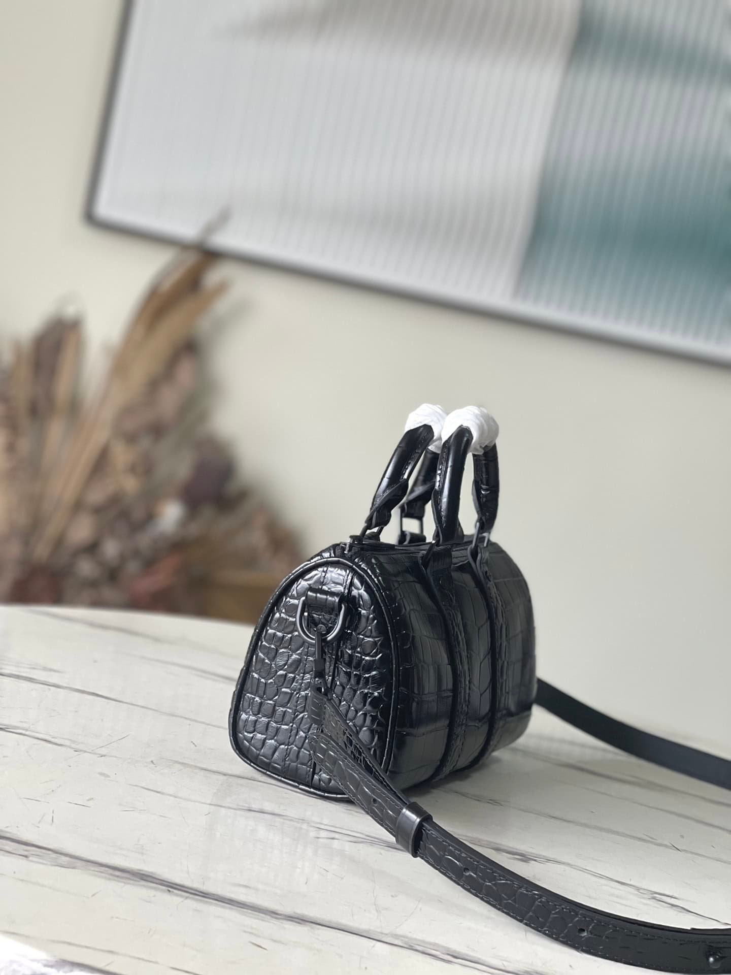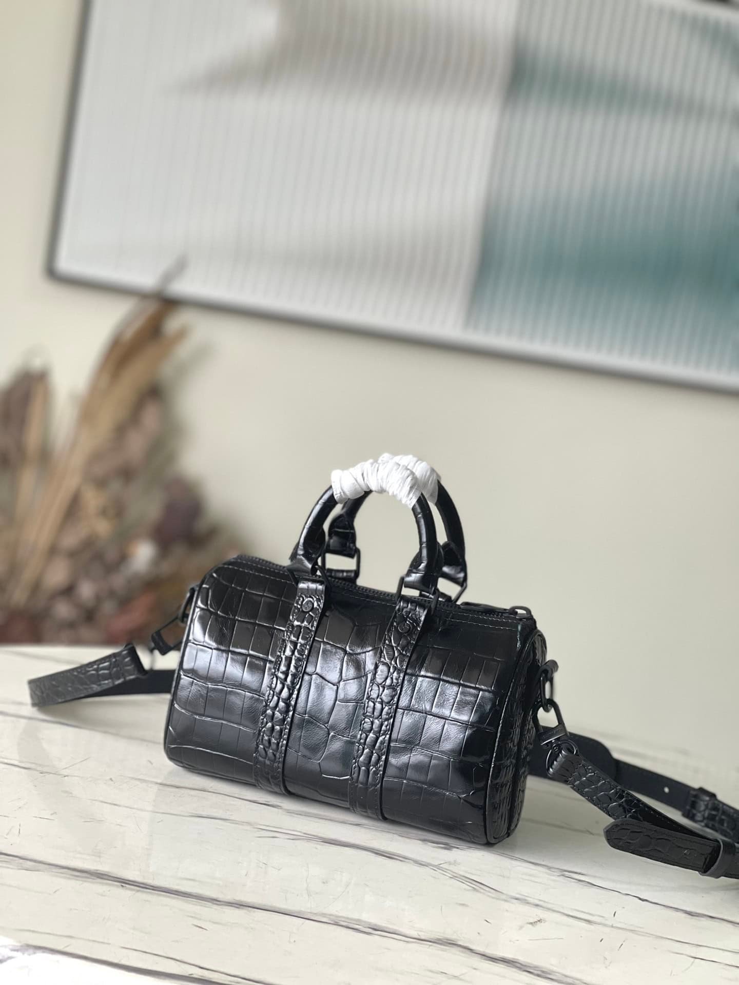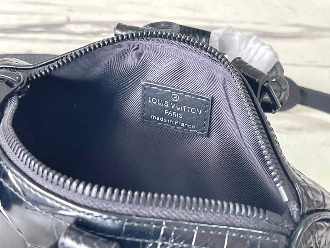 Black crocodile pattern men’s bag pillow bag series This Keepall 25 handbag is made of Monogram Eclipse Reverse canvas, the reinforced strap continues the iconic elements of the Keepall series, and the zipper closure keeps personal items safe with you.