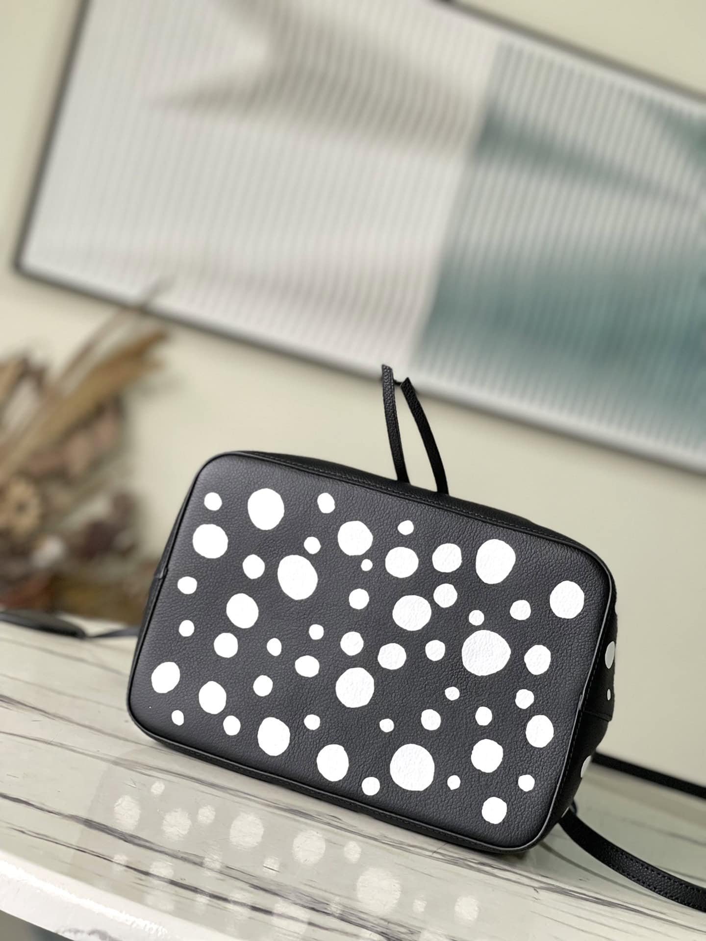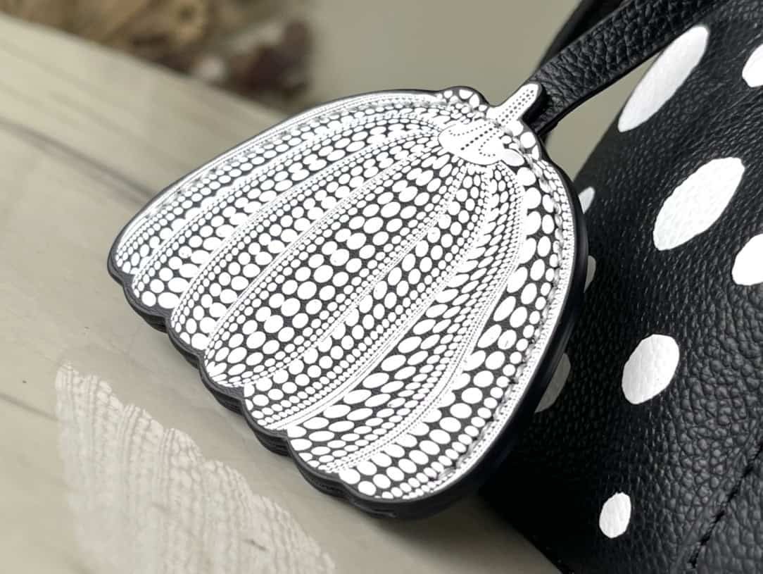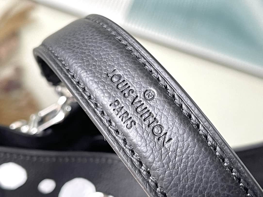 Top layer leather black dot LV x YK NéoNoé BB handbag is from the x Yayoi Kusama cooperation series, condensing the creative energy of the infinite wave point world. Monogram embossed calfskin reflects Yayoi Kusama’s signature polka dots, and the detachable pumpkin-shaped decoration adds the artist’s visual calling card.