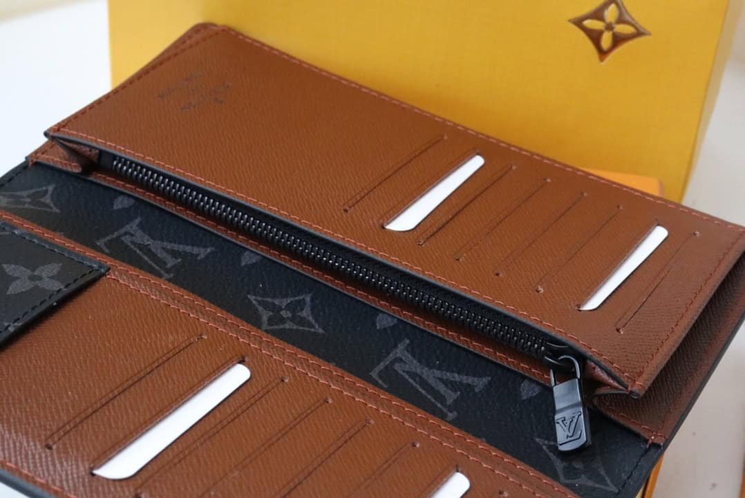 The Brazza Wallet is a larger men’s wallet that keeps things organized. The outer layer is made of Epi embossed leather, while the inner layer of the wallet is smooth leather with Monogram Eclipse canvas for an elegant and masculine style. This Brazza wallet features a large zipped compartment for small change and features multiple slots for credit cards and bills.