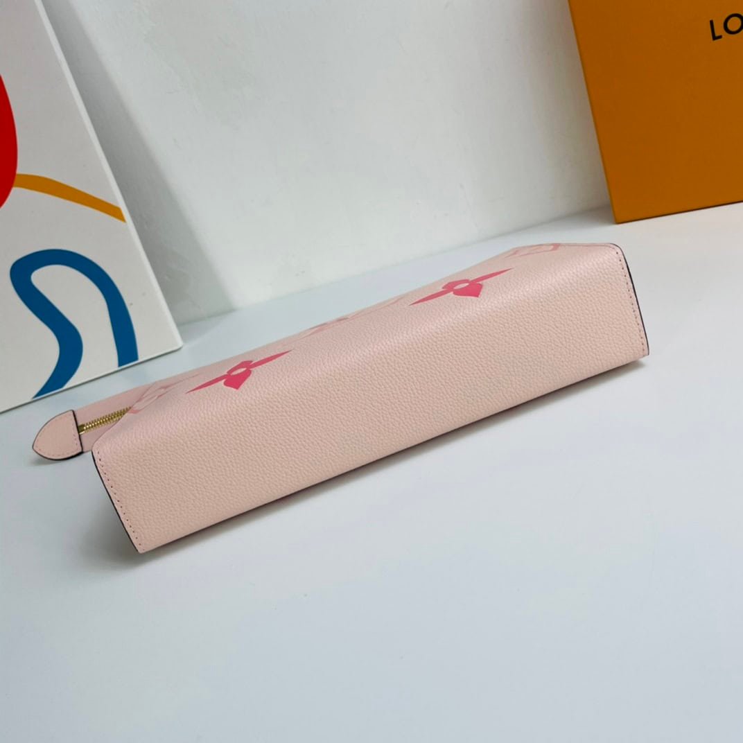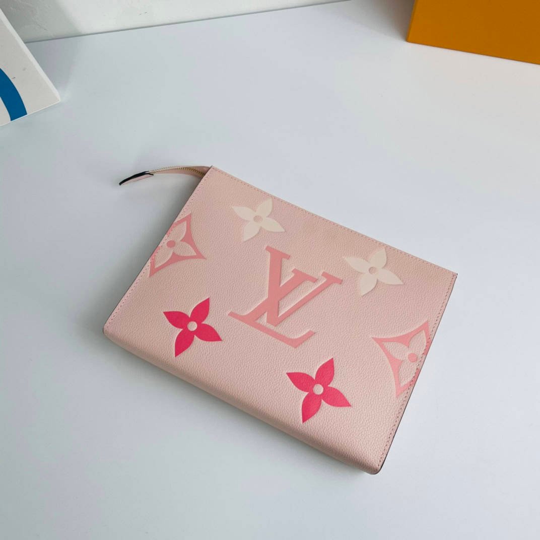 The By The Pool toilet bag 26 is crafted from supple leather with Monogram embossing. Cream leather complements the Monogram floral motif and saffron LV signature. It’s roomy and has a washable interior. The wide mouth allows for easy access, making it a practical travel companion.