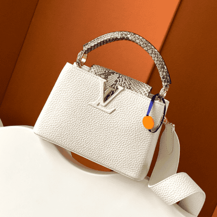 The Ca Bucines BB handbag is made of calfskin imported from France, with shiny metal accessories. The unique Ca Bucines cover can be stored inside the bag to display the letter logo, or can be turned outward to display the Monogram Flower pattern.