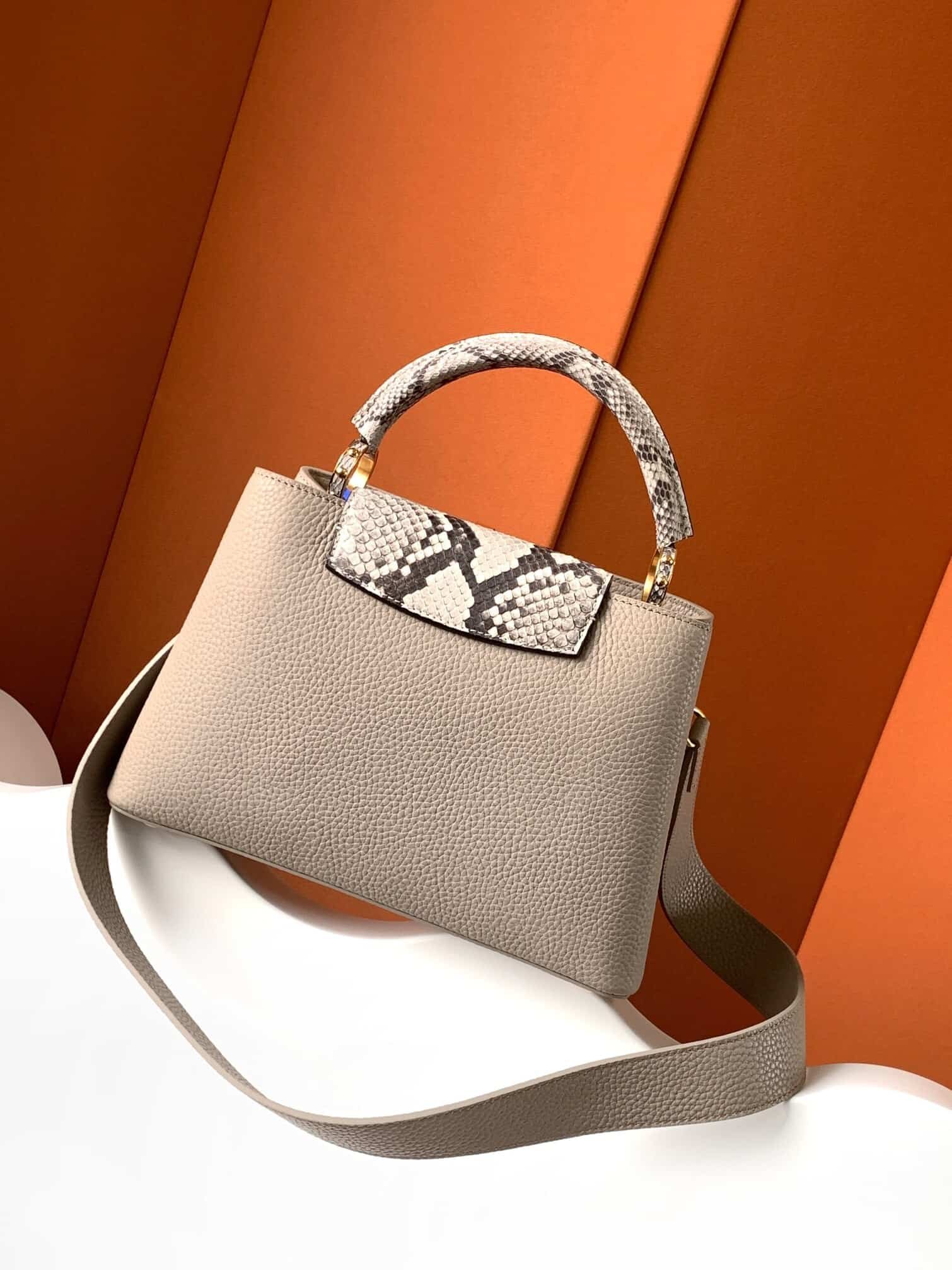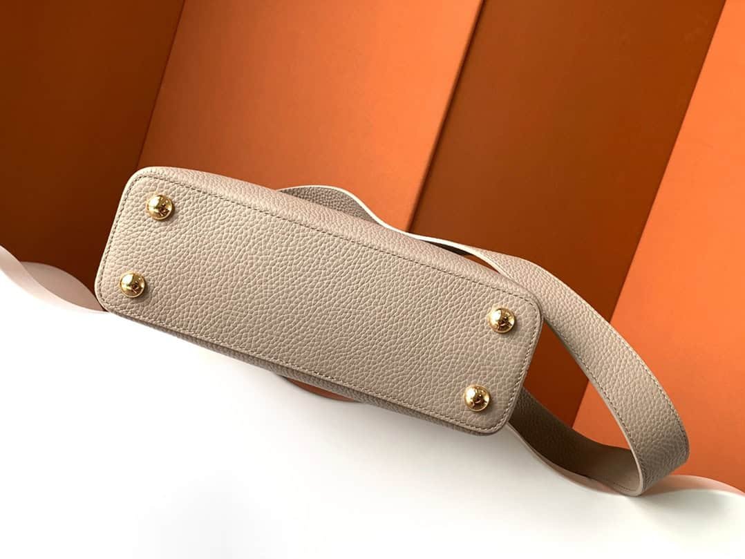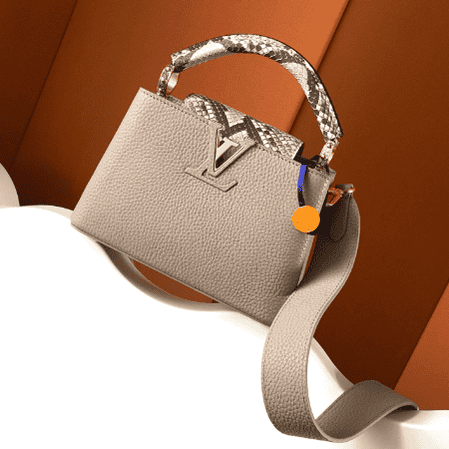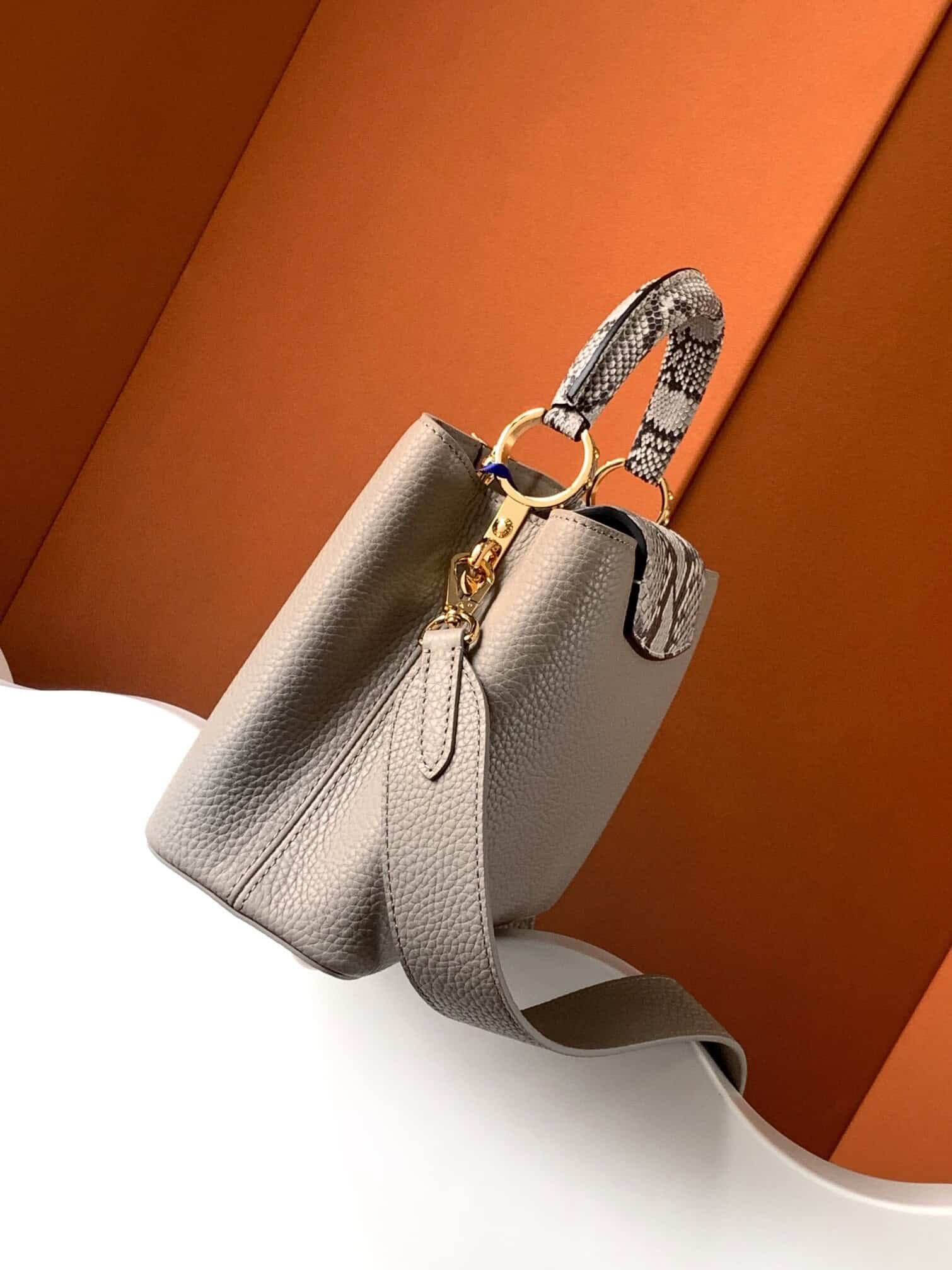 The Ca Bucines BB handbag is made of calfskin imported from France, with shiny metal accessories. The unique Ca Bucines cover can be stored inside the bag to display the letter logo, or can be turned outward to display the Monogram Flower pattern.