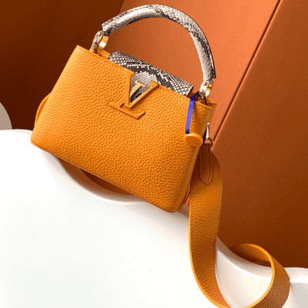 The Ca Bucines BB handbag is made of calfskin imported from France, with shiny metal accessories. The unique Ca Bucines cover can be stored inside the bag to display the letter logo, or can be turned outward to display the Monogram Flower pattern.