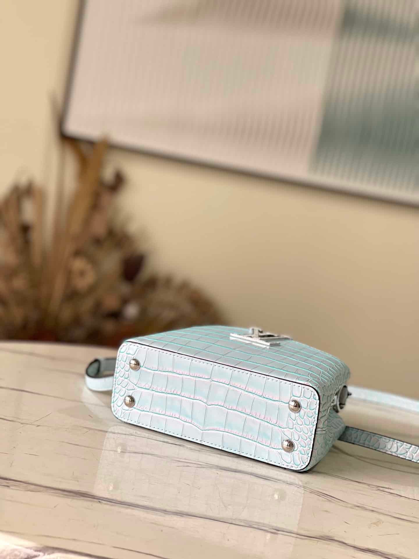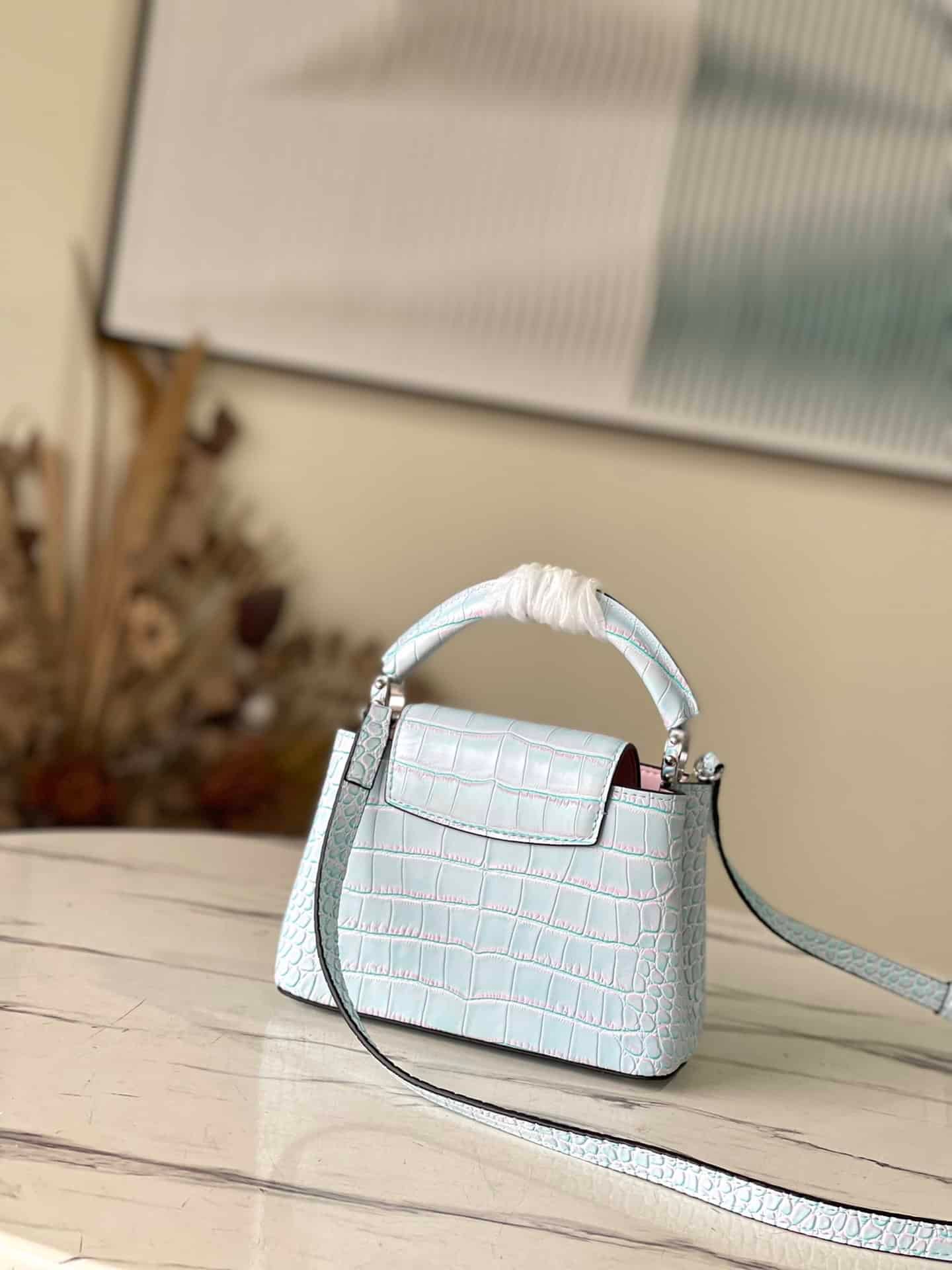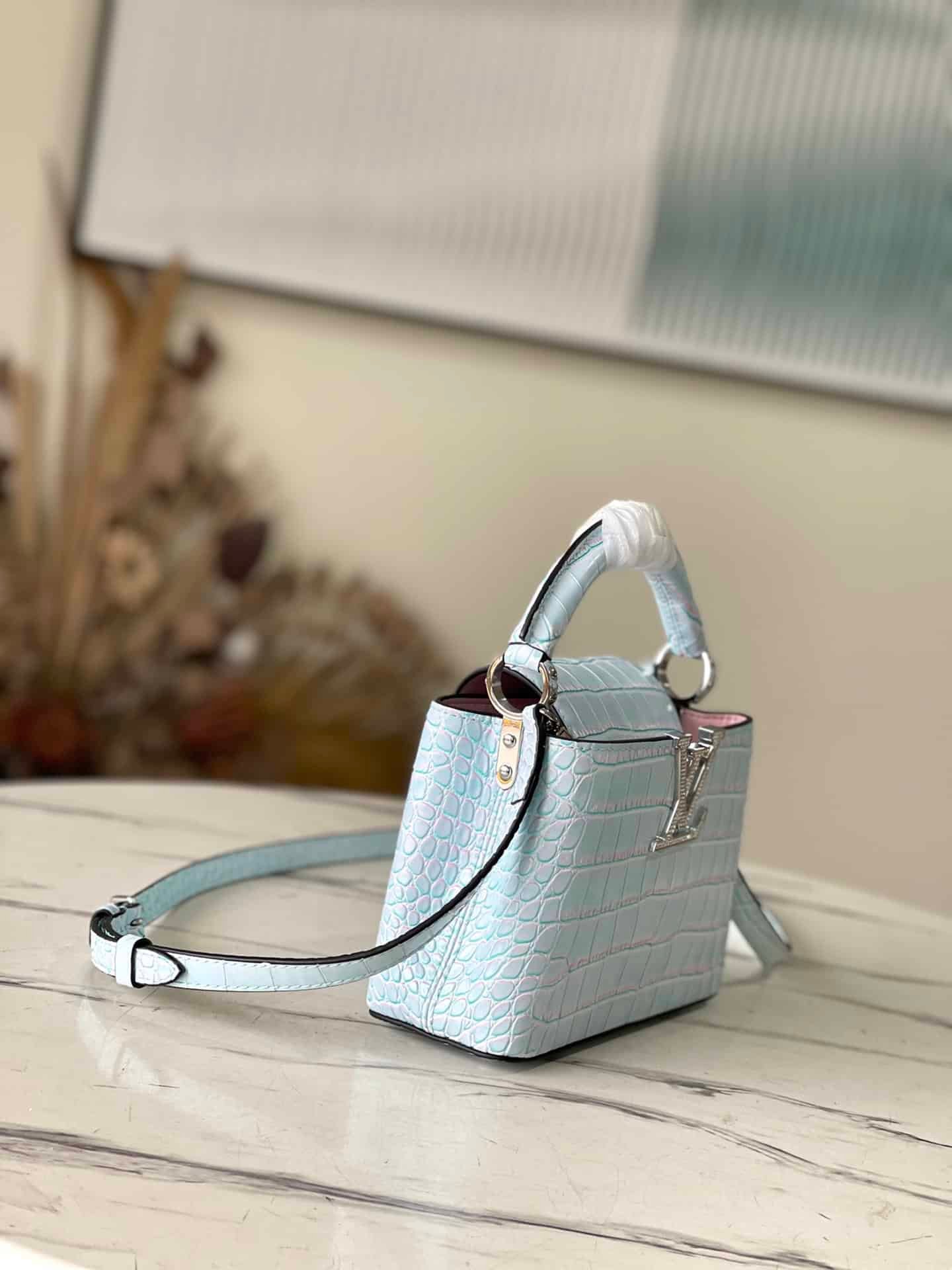 Blue silk rose diamond buckle mini This Capucines BB handbag uses rare leather to declare the modern atmosphere. Its crocodile leather woven chain can be removed at will, making it easy to switch between shoulder and crossbody.
