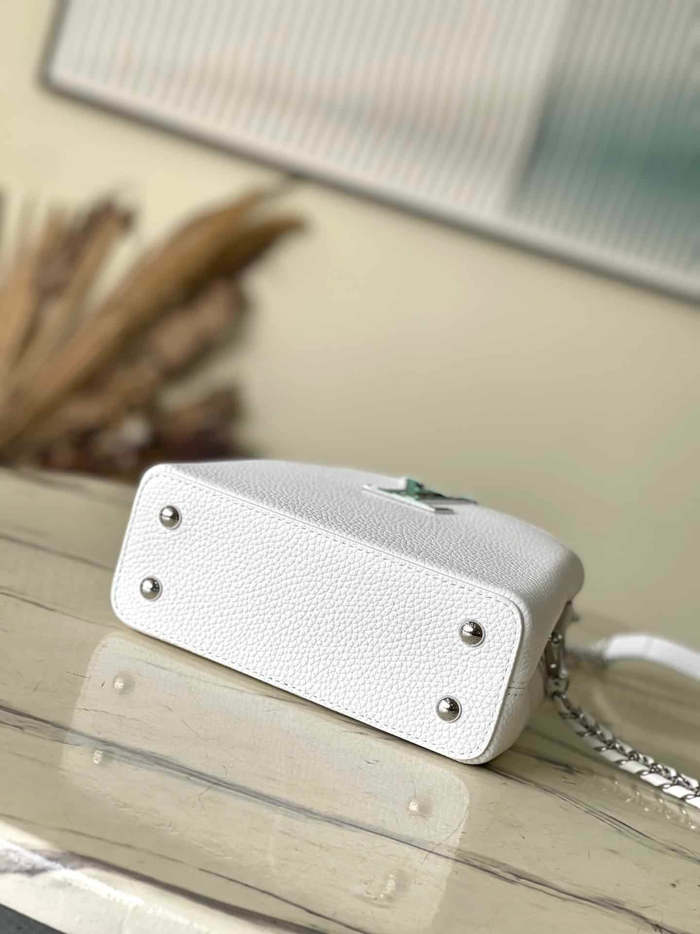 Capushine series launches this Capucines mini handbag. The luminous Taurilon leather presents a lustrous texture through the spray-painting process, admiring the warm sunshine above the first snow in winter and under the wine. Lettering and handle rests feature a chic gloss inspired by ski goggles.