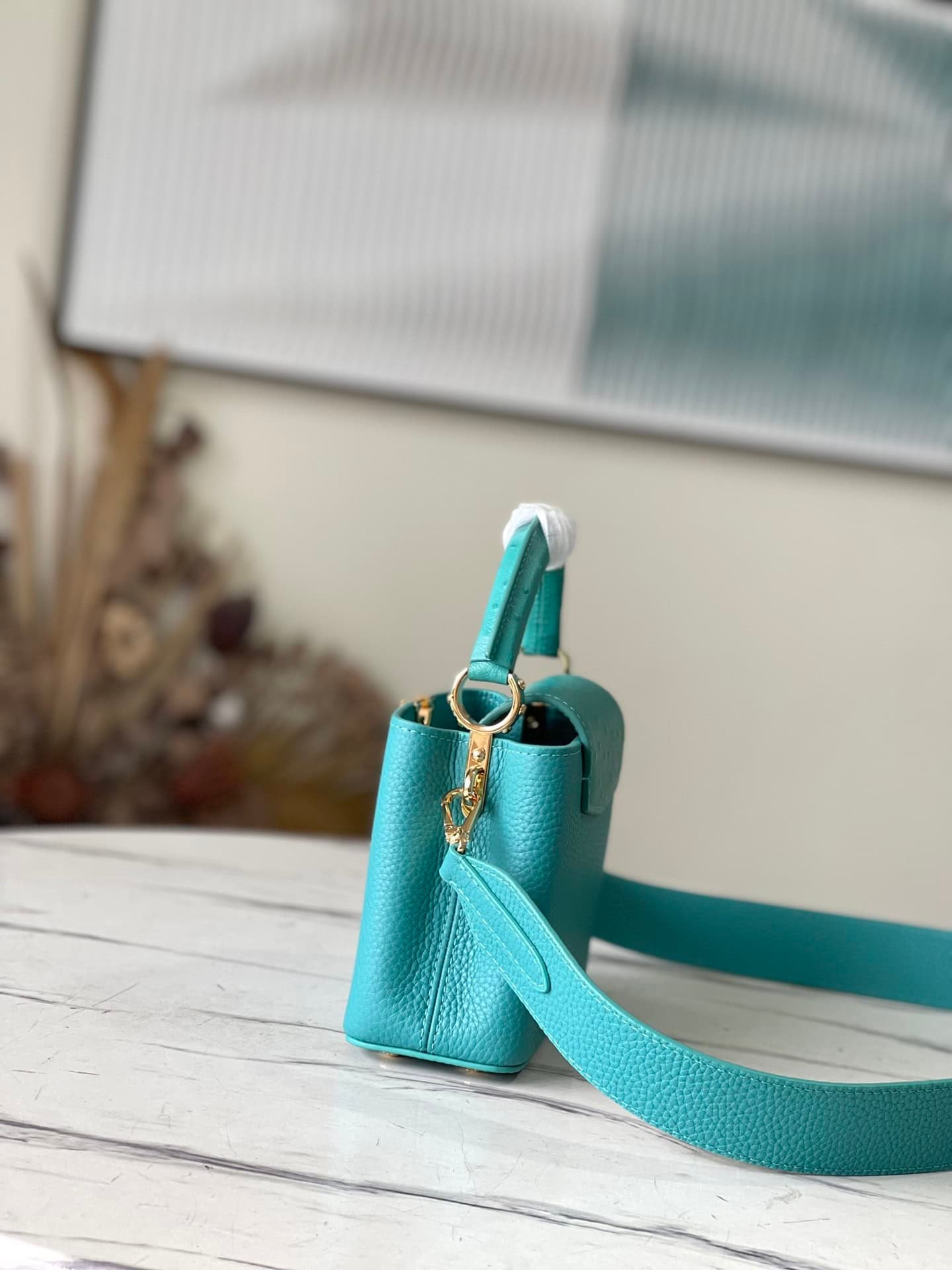 Green This Capucines small handbag is made of Taurillon leather to shape the exquisite shape. The flap, handle and L letter are wrapped in ostrich leather. The flap can be placed outside or inside to read the L logo. The wide leather shoulder strap is detachable Full of modern style.